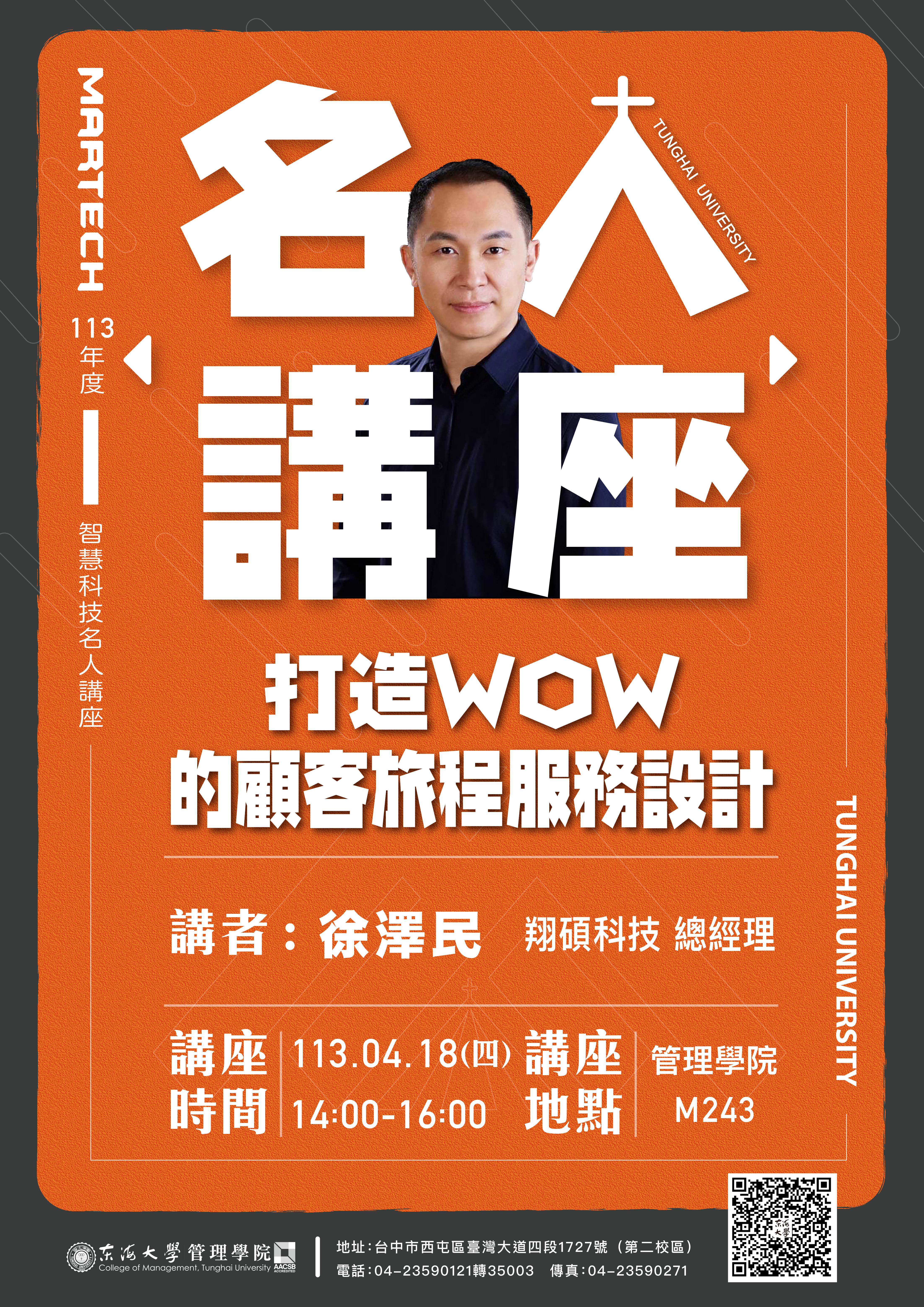 東海大學管理學院很榮幸邀請到翔碩科技總經理 徐澤民,他將以【打造WOW的顧客旅程服務設計】為題,帶我們從企業實務運作經驗,瞭解到他們是如何重新詮釋客戶服務實現數位化服務,透過服務設計建造成CRM的分析量體,再將CRM量體最終形成生意模式的重要環節,並在競爭激烈的市場中取得優勢地位。