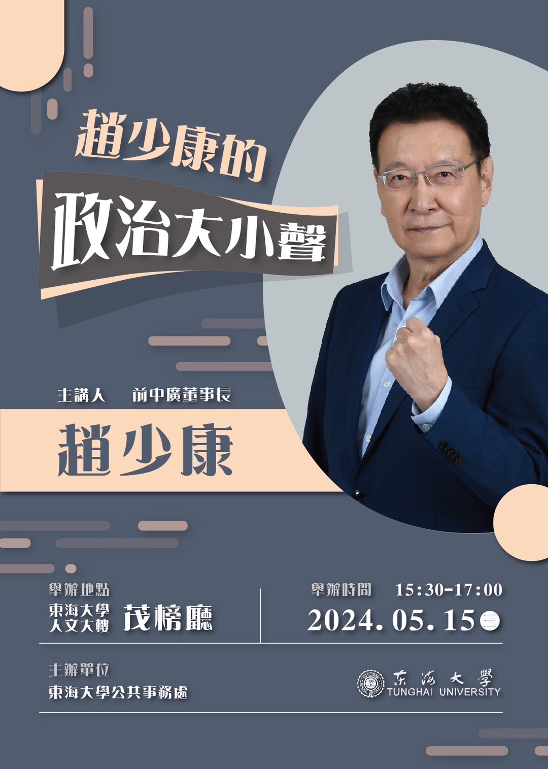 趙少康的政治大小聲 加入Google行事曆 | 東海大學 茂榜廳 | 2024-05-15 ~ 2024-05-15 | 15:30 ~ 17:00 | 2 | 160 | 160 |