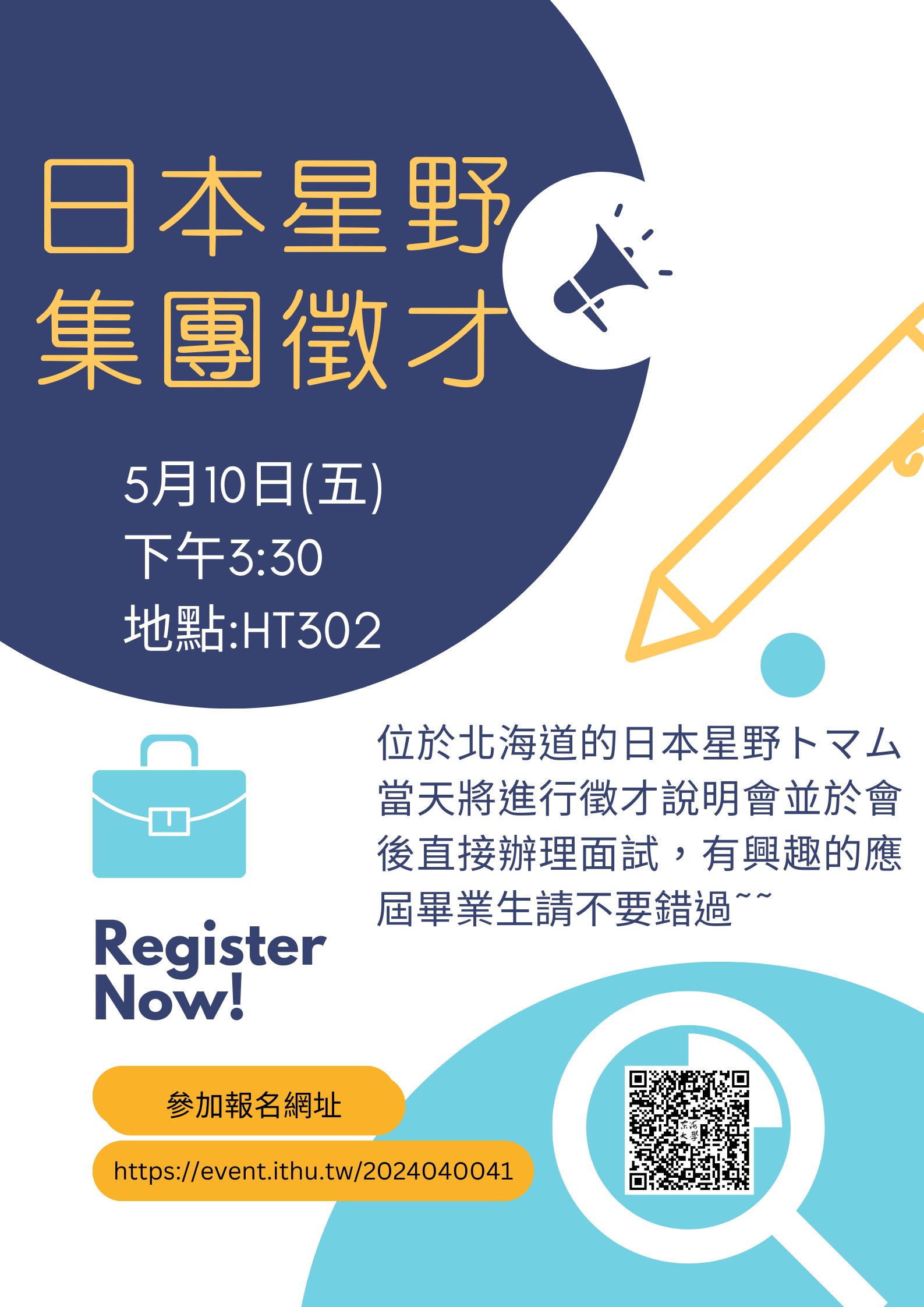 | 日本星野トマム徵才說明會 加入Google行事曆 | HT302 | 2024-05-10 ~ 2024-05-10 | 15:30 ~ 17:00 | 1 | 50 | 2 |