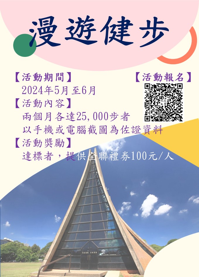 | 漫遊健步 加入Google行事曆 | 不限制 | 2024-05-01 ~ 2024-06-30 | 00:00 ~ 23:55 | 2 | 30 | 30 |