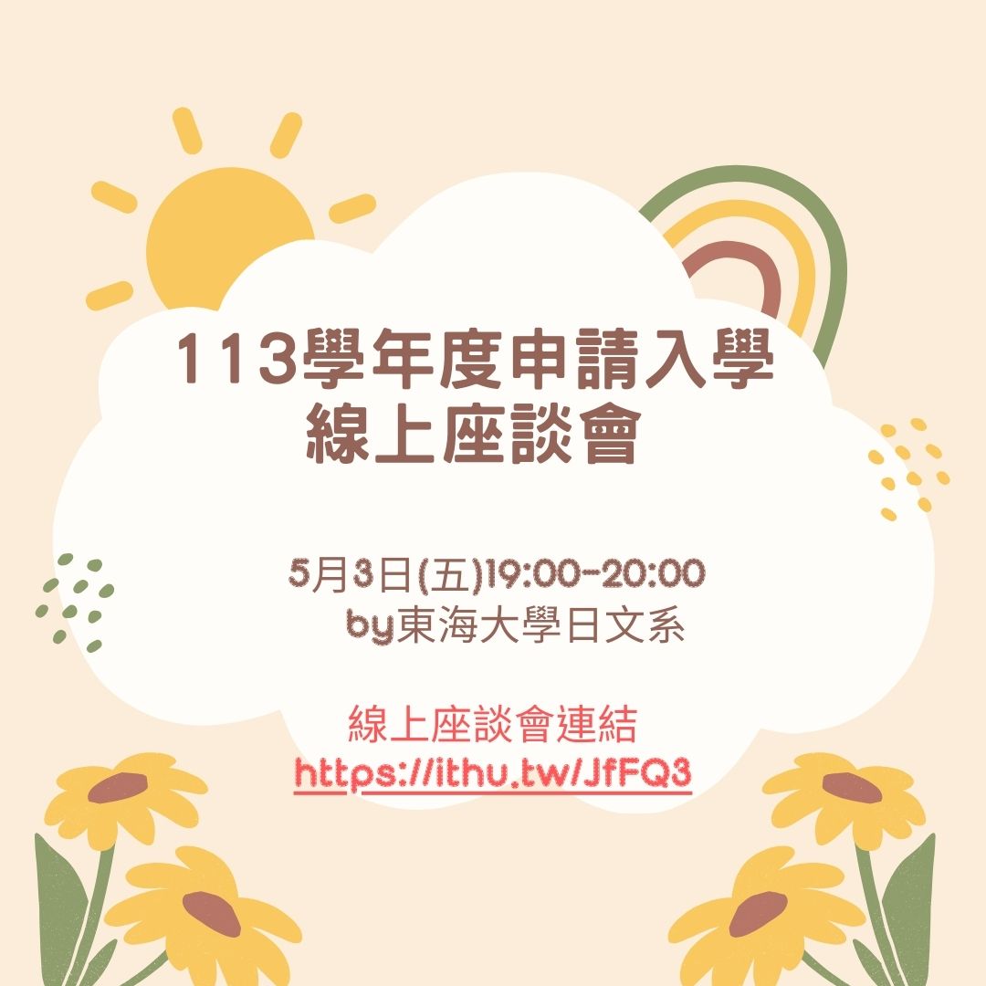 | 東海大學日文系113學年度申請入學線上座談會 加入Google行事曆 | 線上連結:https://ithu.tw/JfFQ3 | 2024-05-03 ~ 2024-05-03 | 19:00 ~ 20:00 | 1 | 不限 | 35 |