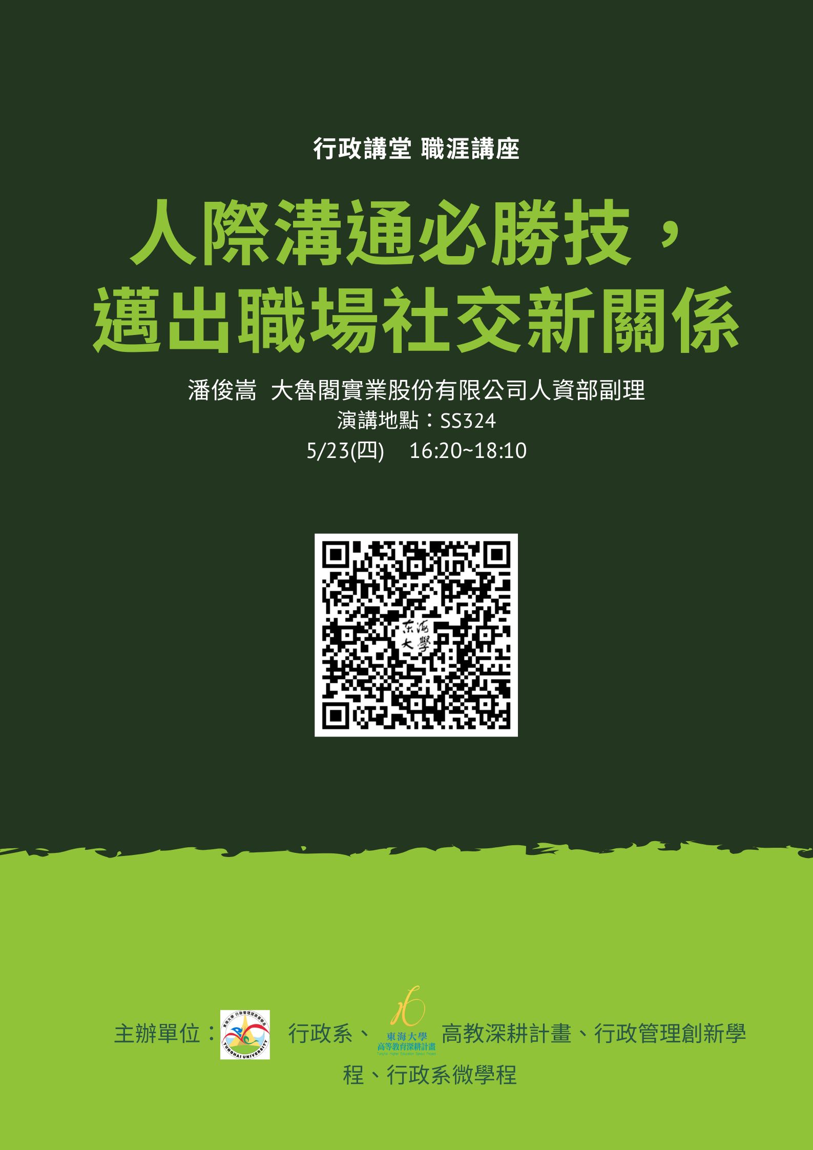 | 人際溝通必勝技,邁出職場社交新關係。主辦單位:行政系、高教深耕計畫、行政管理創新學程、行政系微學程。【1891職涯引導與發展(X)】 加入Google行事曆 | SS324 | 2024-05-23 ~ 2024-05-23 | 16:20 ~ 18:10 | 2 | 70 | 77 |