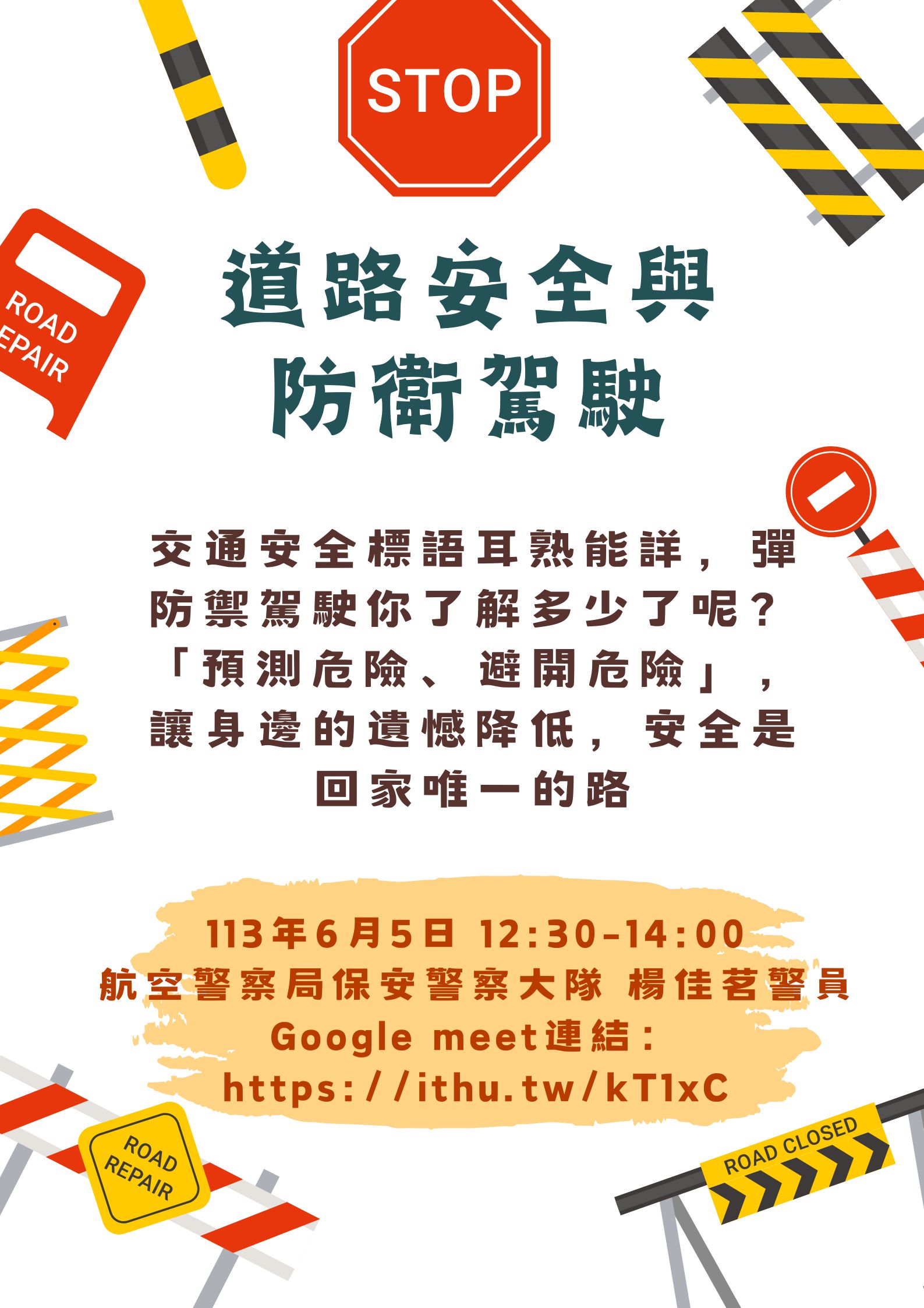| 道路安全與防衛駕駛 加入Google行事曆 | GOOGLE MEET | 2024-06-05 ~ 2024-06-05 | 12:30 ~ 14:00 | 1.5 | 不限 | 106 |