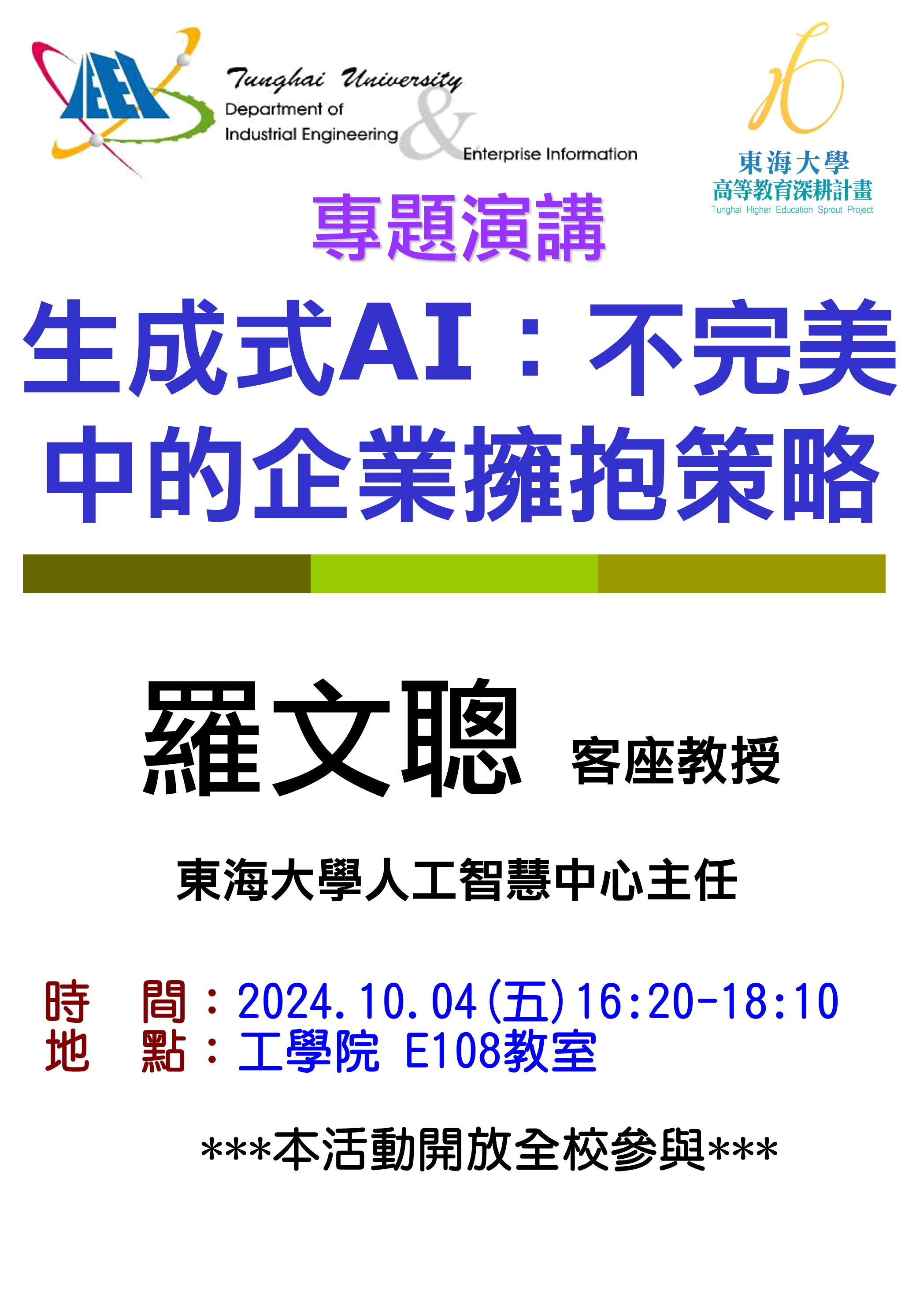| 【工工系專題演講】10/4 生成式AI:不完美中的企業擁抱策略 加入Google行事曆 | 東海大學工學院 E108教室 | 2024-10-04 ~ 2024-10-04 | 16:20 ~ 18:10 | 1.5 | 70 | 68 |