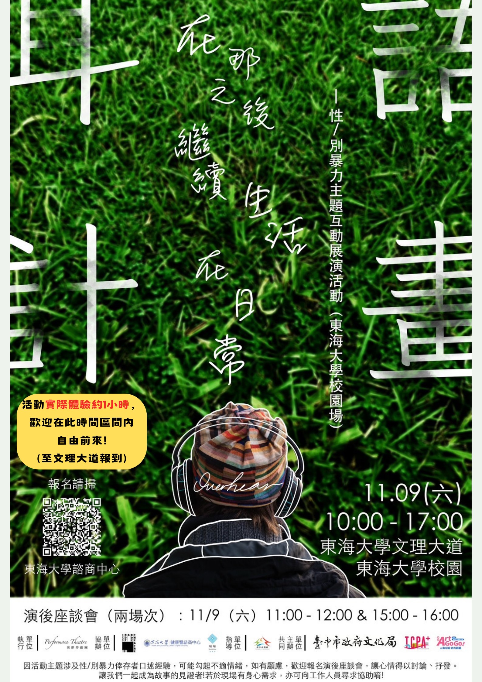 健康暨諮商中心本學期與校外「演摩莎」及「非盒」劇團的展演計畫合作,推出"【在那之後繼續生活在日常】性/別暴力主題互動展演活動",在校內多處設立表演場地,讓參與者運用劇團開發之專屬APP輔以與該展場演員的互動,走入一個個故事中成為見證者,進而對性別暴力創傷的樣貌及復原歷程有更多理解,如有意願還可一併參加展後座談會,在講師帶領下回顧展演內容,共同討論,提出任何你想了解的問題。