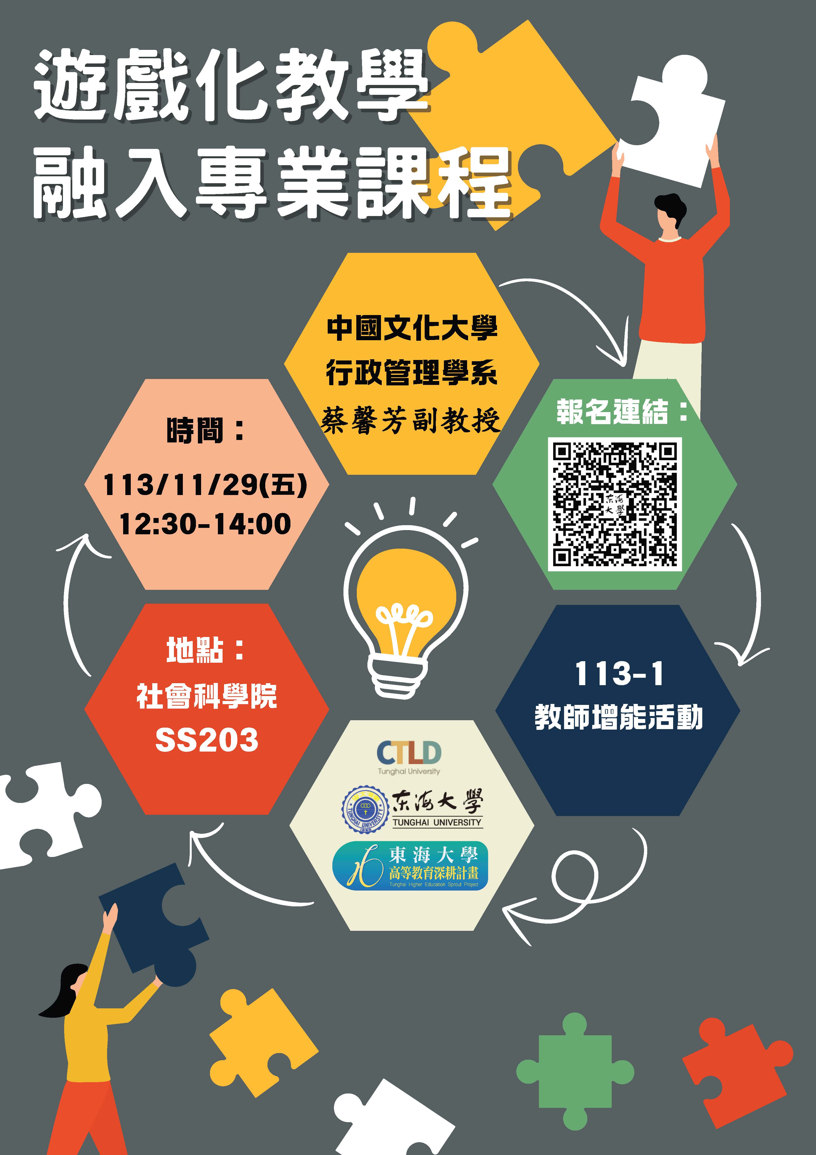 | 【教師增能活動】遊戲化教學融入專業課程 加入Google行事曆 | 社會科學院SS203 | 2024-11-29 ~ 2024-11-29 | 12:30 ~ 14:00 | 1.5 | 45 | 48 |