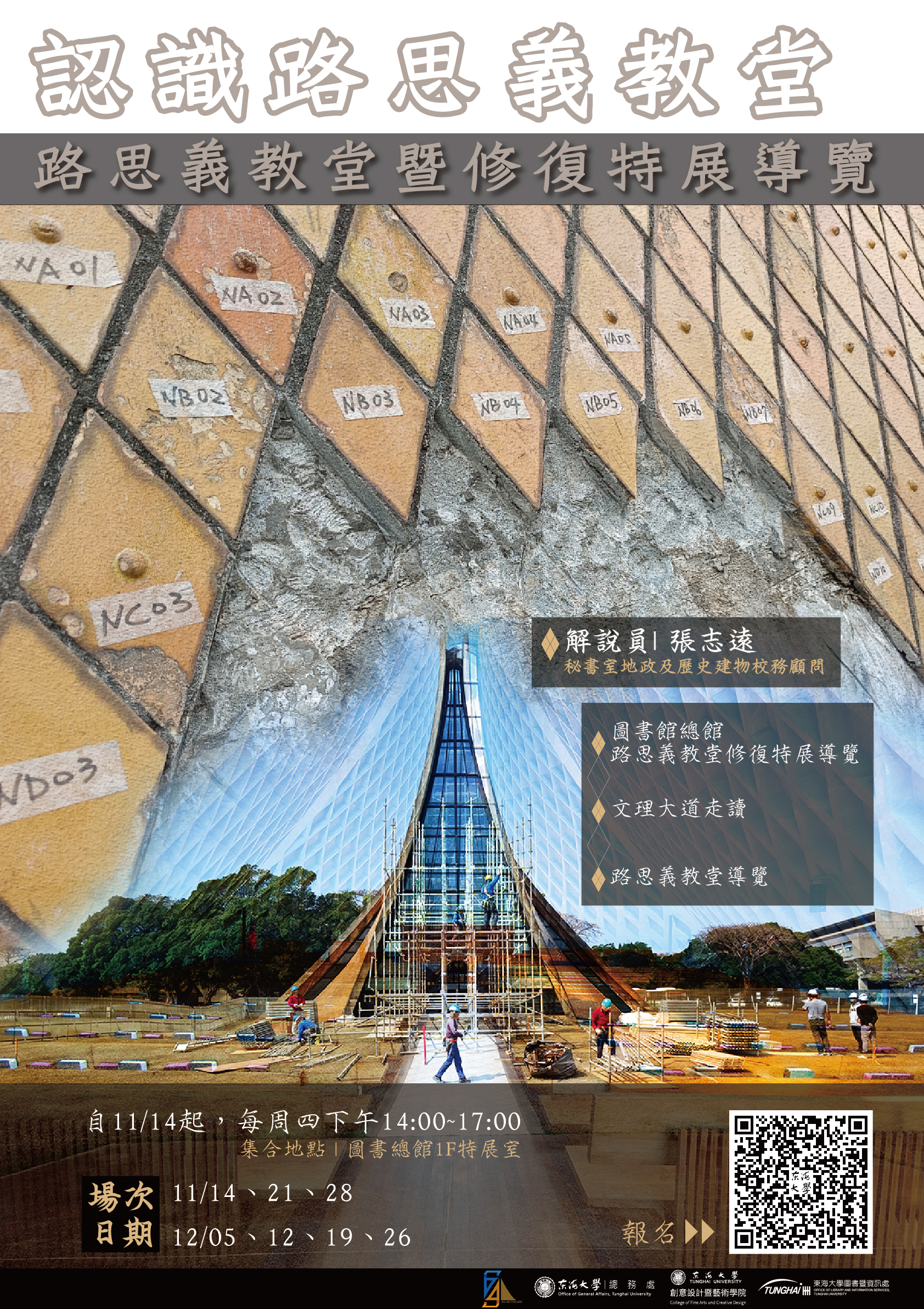 | 11/21(四) 14:00-17:00 路思義教堂暨修復特展導覽 加入Google行事曆 | 圖書總館1F特展室 | 2024-11-21 ~ 2024-11-21 | 14:00 ~ 17:00 | 3 | 30 | 30 |