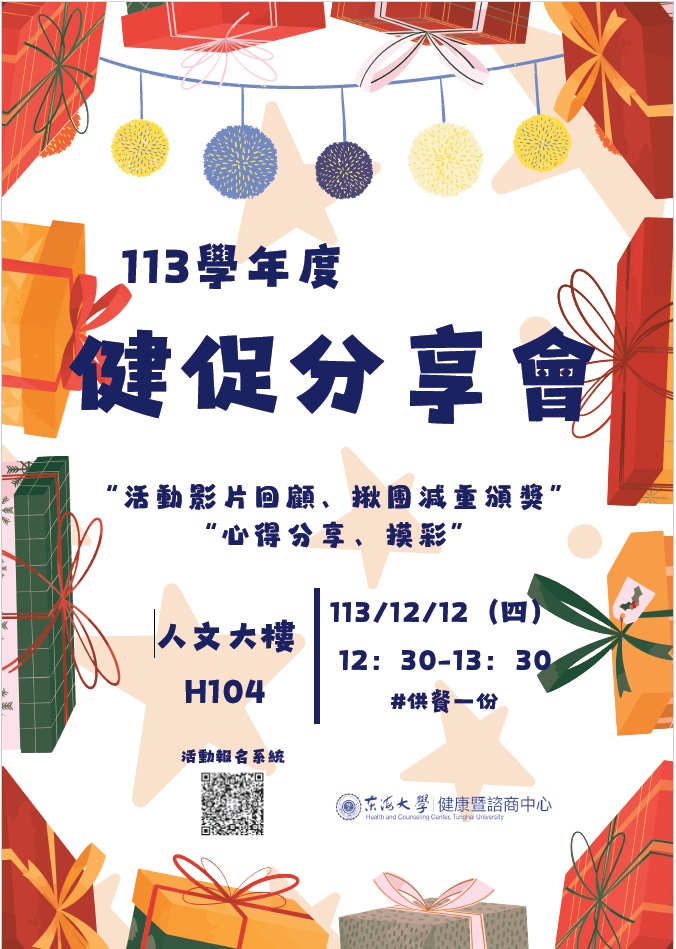| 113-1健促分享會 加入Google行事曆 | 人文大樓H104 | 2024-12-12 ~ 2024-12-12 | 12:30 ~ 13:30 | 1 | 70 | 78 |