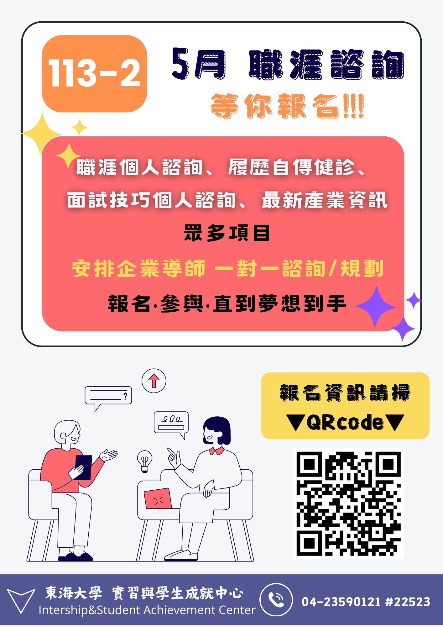 *諮詢項目:職涯發展與規劃、職涯探索與測評解析、履歷健診(含實習)、面試重點與技巧、科系出路發展與產業趨勢