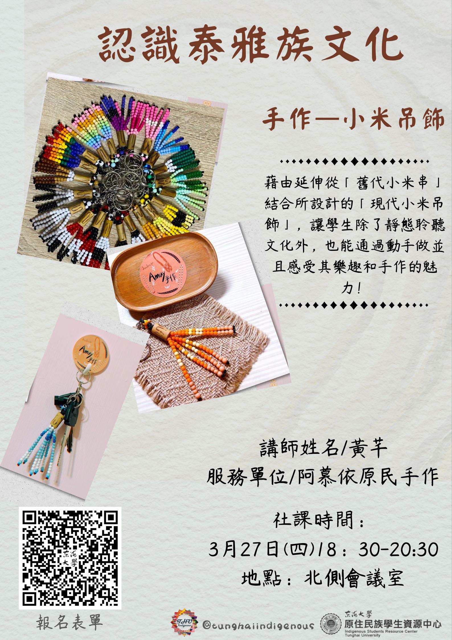 | 【原資中心ㄨ原歸社】文化手作-認識泰雅族文化-小米吊飾 加入Google行事曆 | 北側會議室 | 2025-03-27 ~ 2025-03-27 | 18:30 ~ 20:30 | 2 | 40 | 45 |