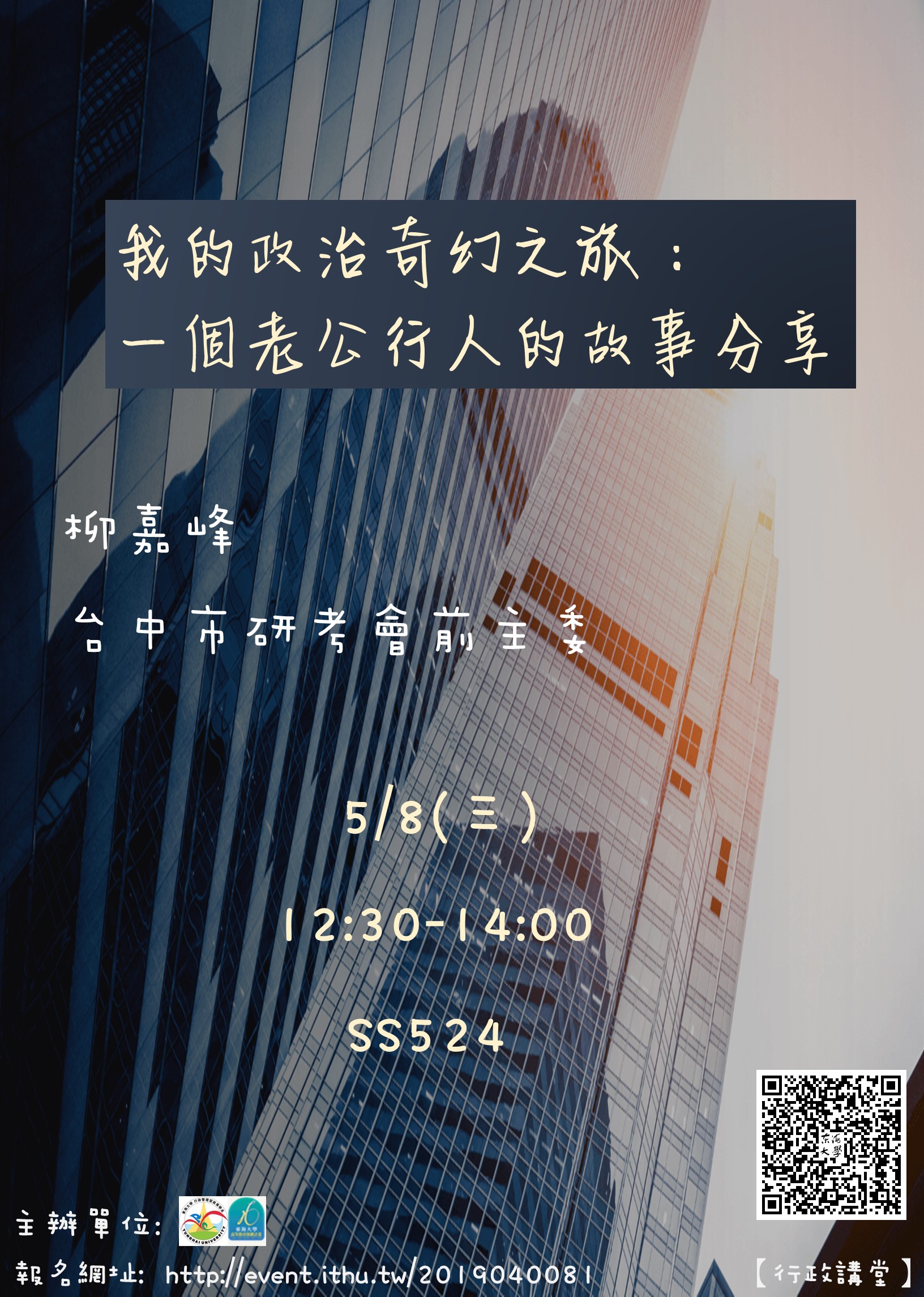 | 的政治奇幻之旅:一個老公行人的故事分享。主辦單位:行政系、公務人力養成學分學程、高教深耕計畫【簽+退】 加入Google行事曆 | ss524 | 2019-05-08 ~ 2019-05-08 | 12:30 ~ 14:00 | 1.5 | 60 | 18 |