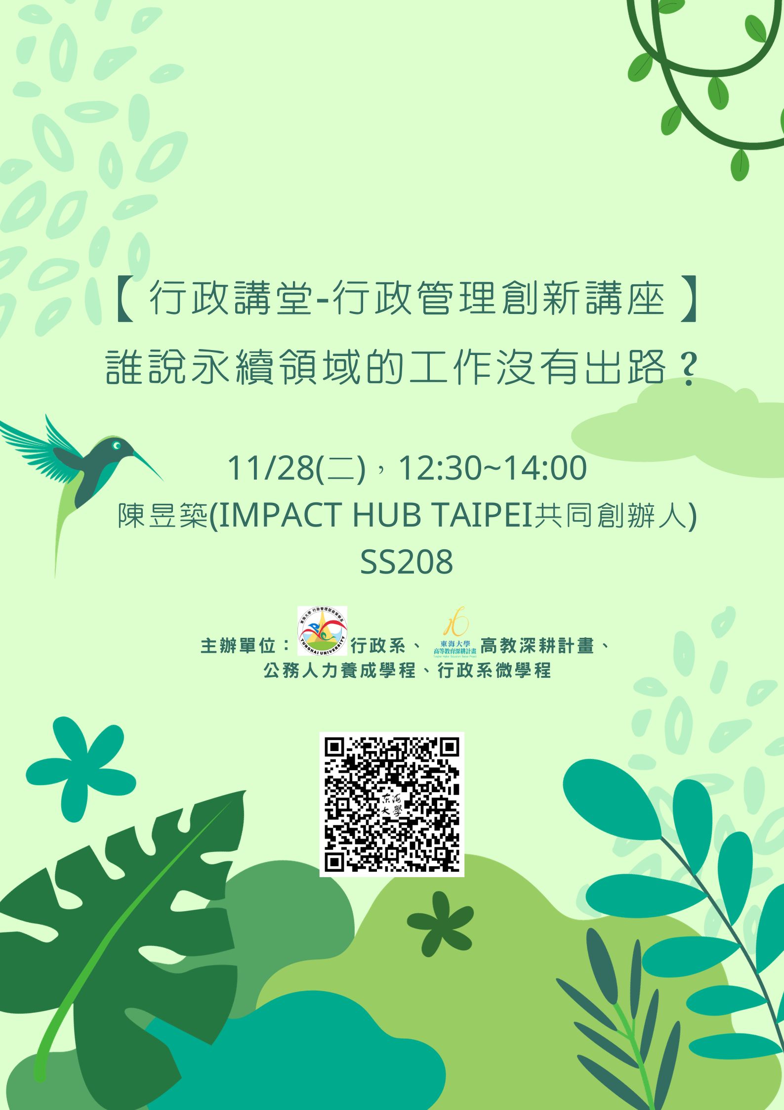 | 11/28,誰說永續領域的工作沒有出路?。主辦單位:行政系、高教深耕計畫、公務人力養成學程、行政系微學程 加入Google行事曆 | SS208 | 2023-11-28 ~ 2023-11-28 | 12:30 ~ 14:00 | 1.5 | 88 | 85 |
