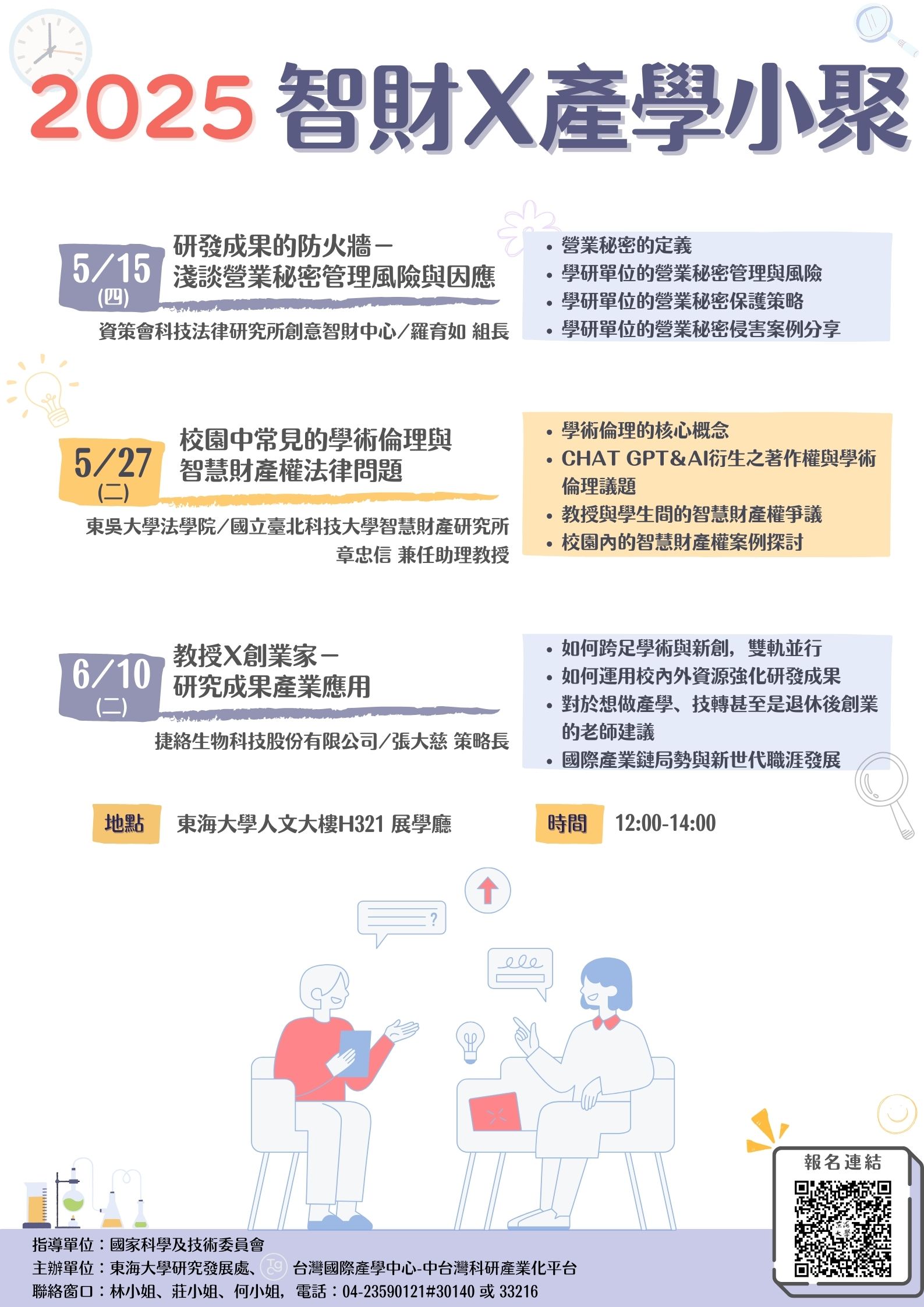 | 校園中常見的學術倫理與智慧財產權法律問題 加入Google行事曆 | 東海大學展學廳(人文大樓H321) | 2025-05-27 ~ 2025-05-27 | 12:00 ~ 14:00 | 2 | 37 | 39 |