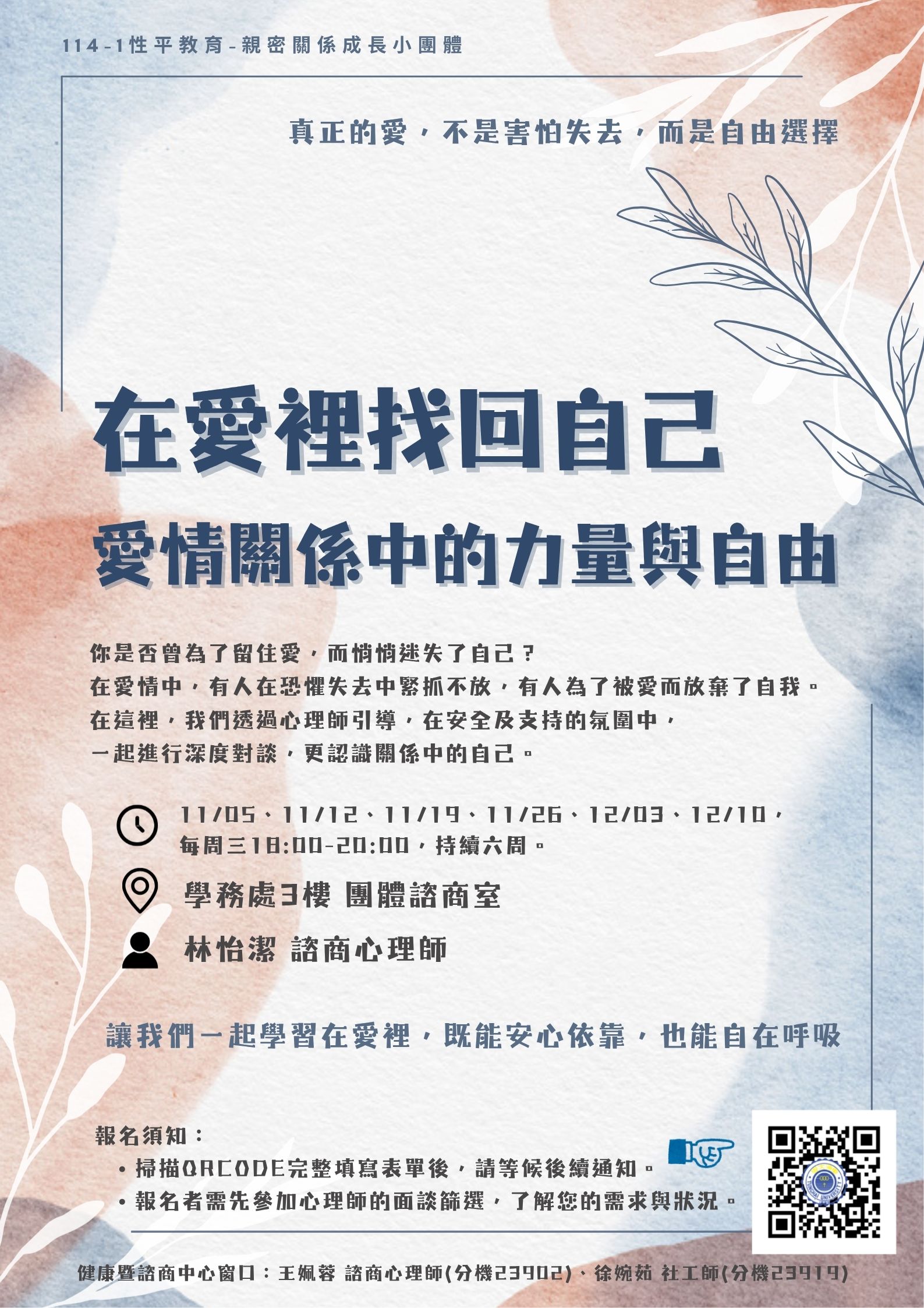 主題為【在愛裡找回自己:愛情關係中的力量與自由~親密關係成長團體】
