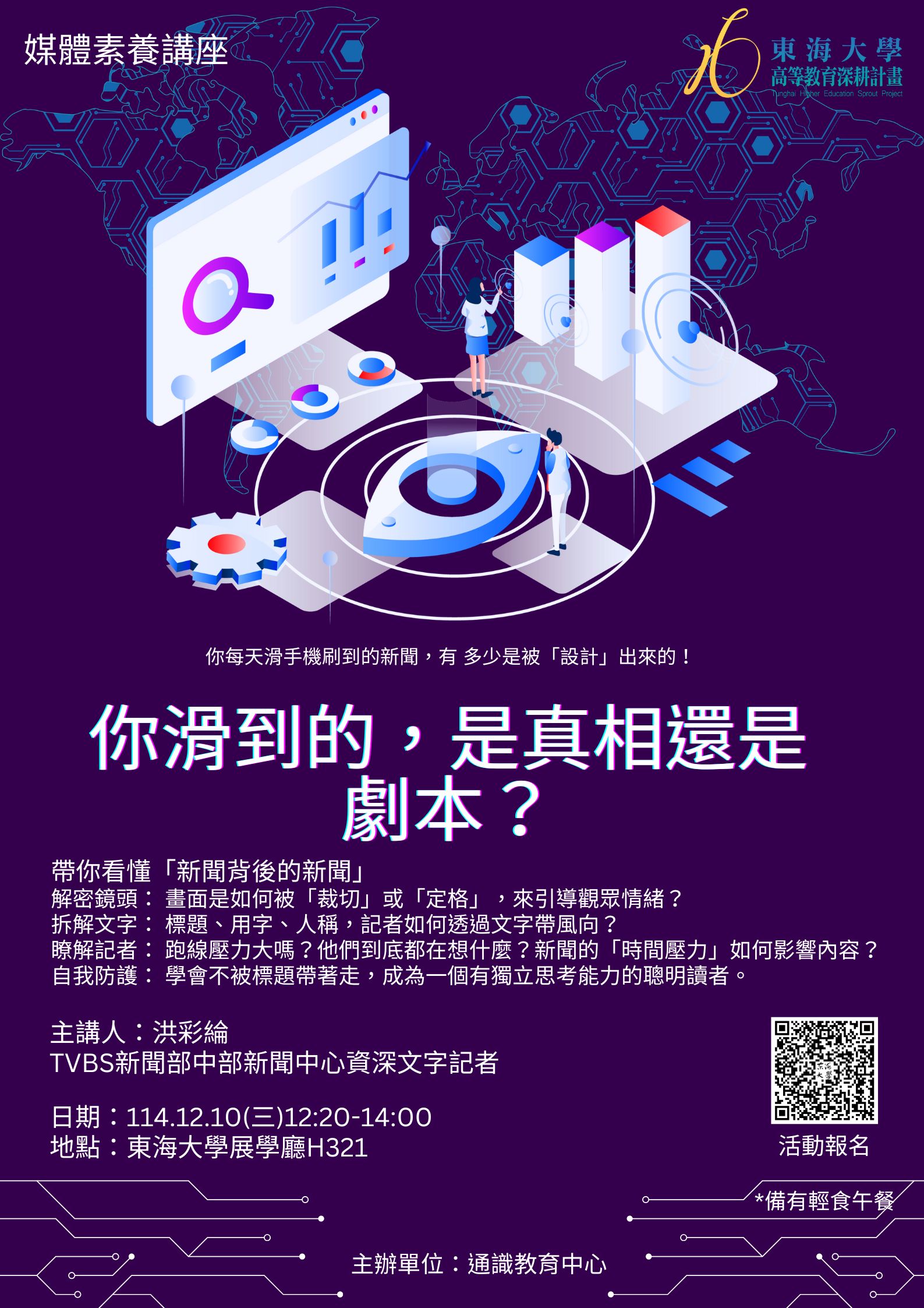 | 你滑到的,是真相還是劇本? 加入Google行事曆 | 東海大學展學廳H321 | 2025-12-10 ~ 2025-12-10 | 12:10 ~ 14:00 | 2 | 35 | 39 |