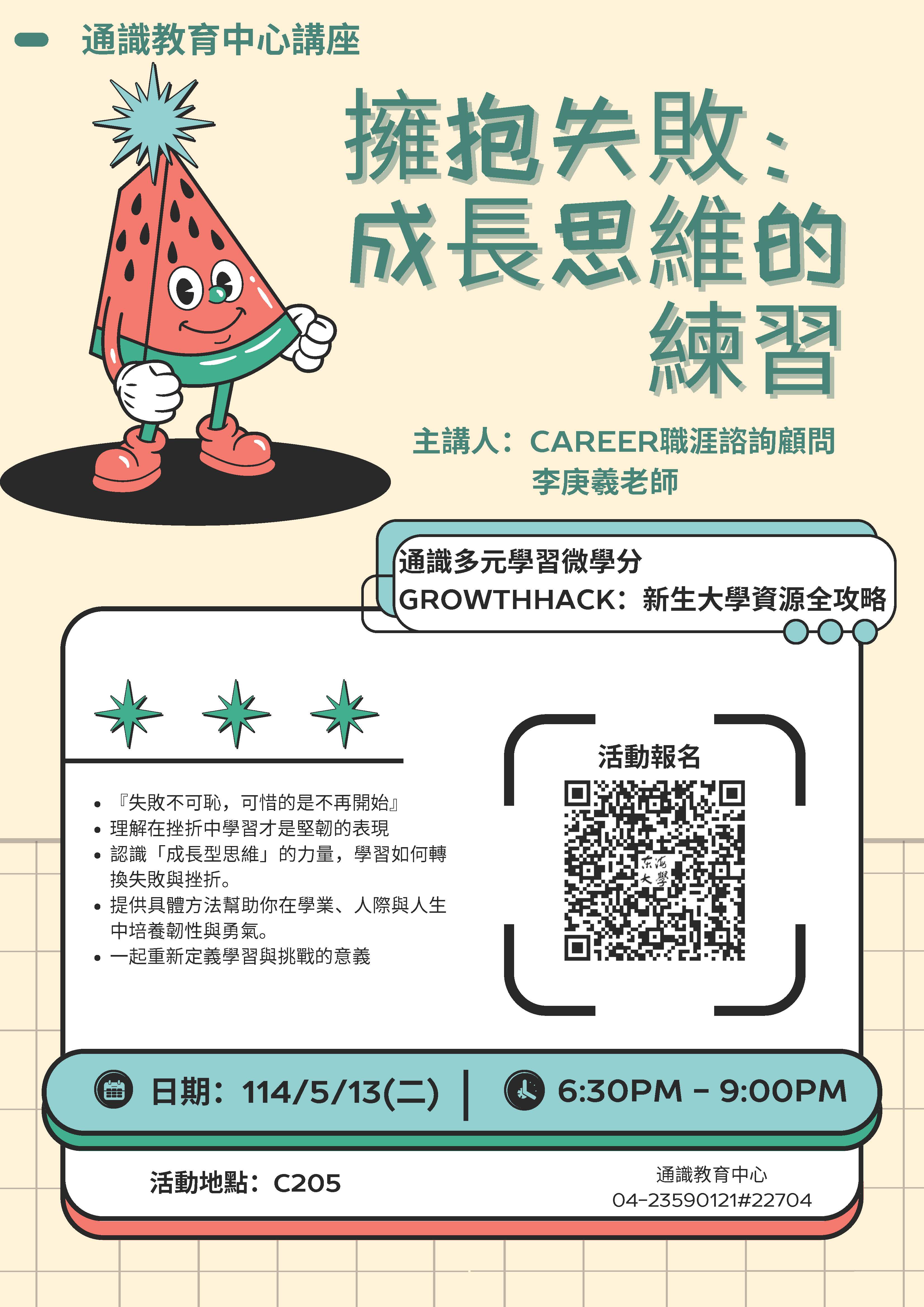 | 擁抱失敗:成長思維的練習 加入Google行事曆 | C205 | 2025-05-13 ~ 2025-05-13 | 18:30 ~ 21:00 | 2.5 | 50 | 19 |