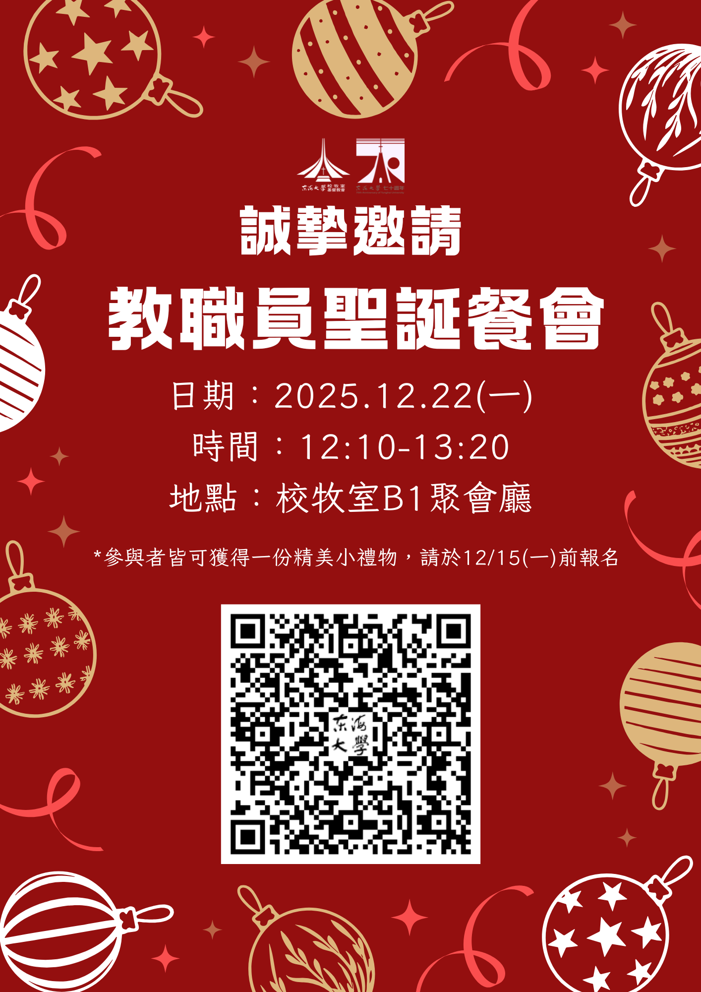 聖誕節是一年當中最令人期待、充滿希望的節日,誠摯邀請教職同仁共享豐盛午餐,一同歡慶耶穌降生,祂為愛而來、降世為人,成為世人的盼望、生命的亮光。席間將由『教職員心韻詩班』帶來詩歌讚美,並於會後贈送精美小禮。期盼您的到來!