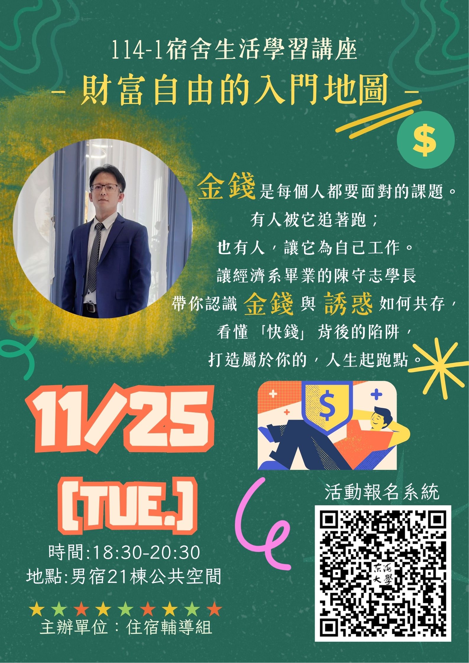 | 【場次二】 財富自由的入門地圖 加入Google行事曆 | 男宿21棟公共空間 | 2025-11-25 ~ 2025-11-25 | 18:30 ~ 20:30 | 2 | 30 | 20 |