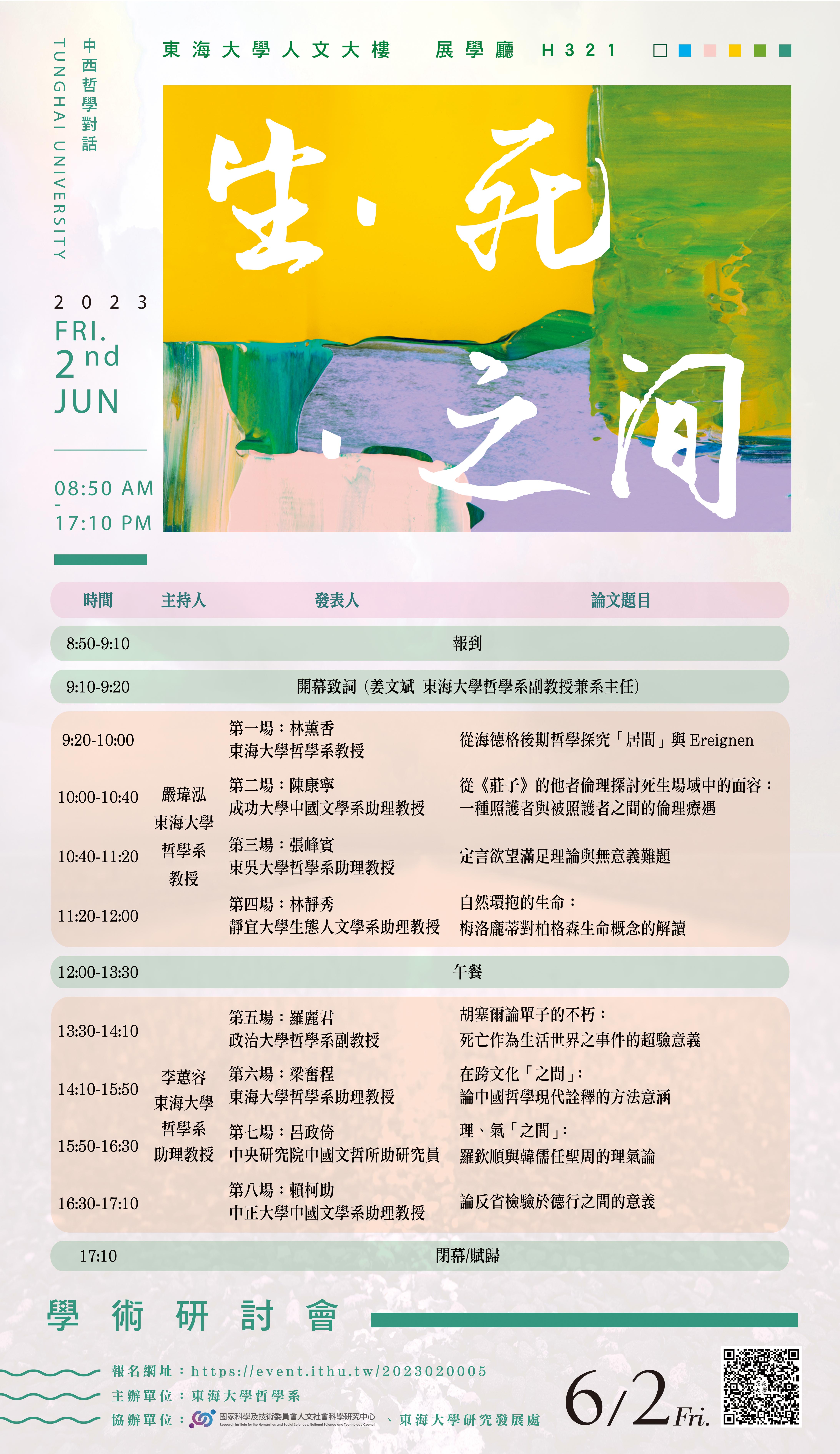| [實體會議] 2023「中西哲學對話:生.死.之間」學術研討會 加入Google行事曆 | 東海大學人文大樓展學廳H321 | 2023-06-02 ~ 2023-06-02 | 09:10 ~ 17:10 | 8 | 不限 | 50 |