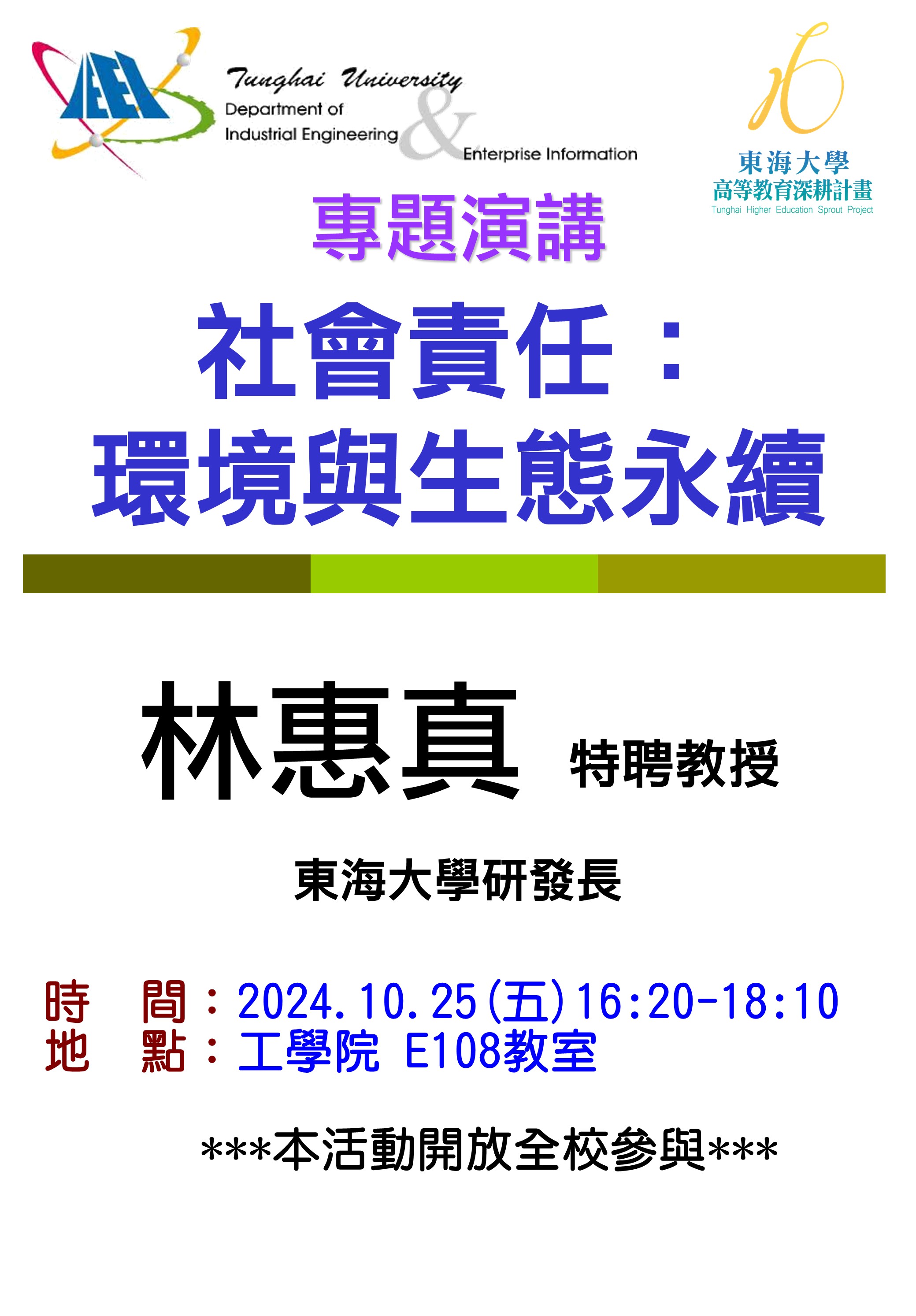 | 【工工系專題演講】10/25 社會責任:環境與生態永續 加入Google行事曆 | 東海大學工學院 E108教室 | 2024-10-25 ~ 2024-10-25 | 16:20 ~ 18:10 | 1.5 | 70 | 69 |