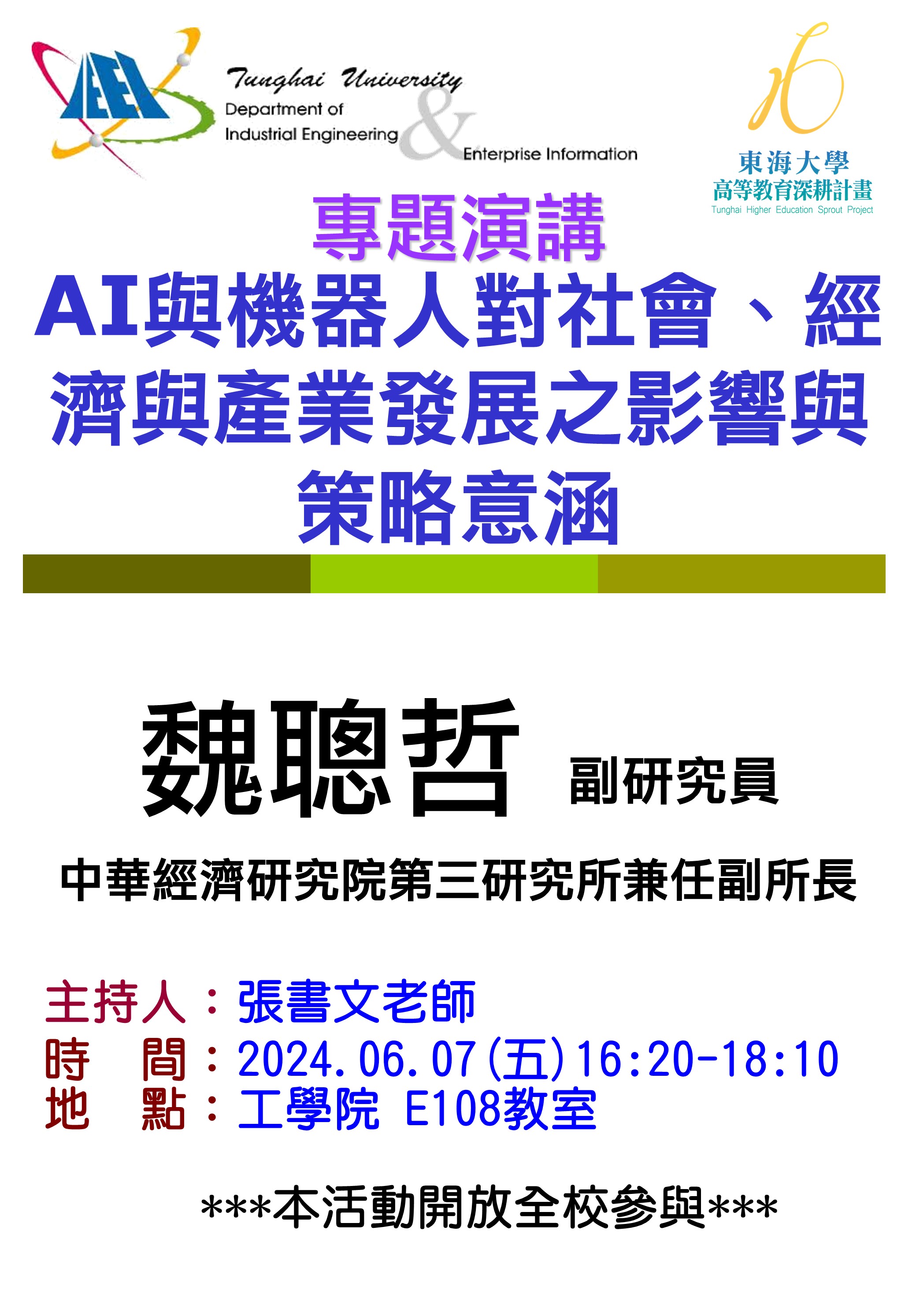 | 【工工系專題演講】6/7 AI與機器人對社會、經濟與產業發展之影響與策略意涵 加入Google行事曆 | 東海大學工學院 E108教室 | 2024-06-07 ~ 2024-06-07 | 16:20 ~ 18:10 | 1.5 | 70 | 44 |