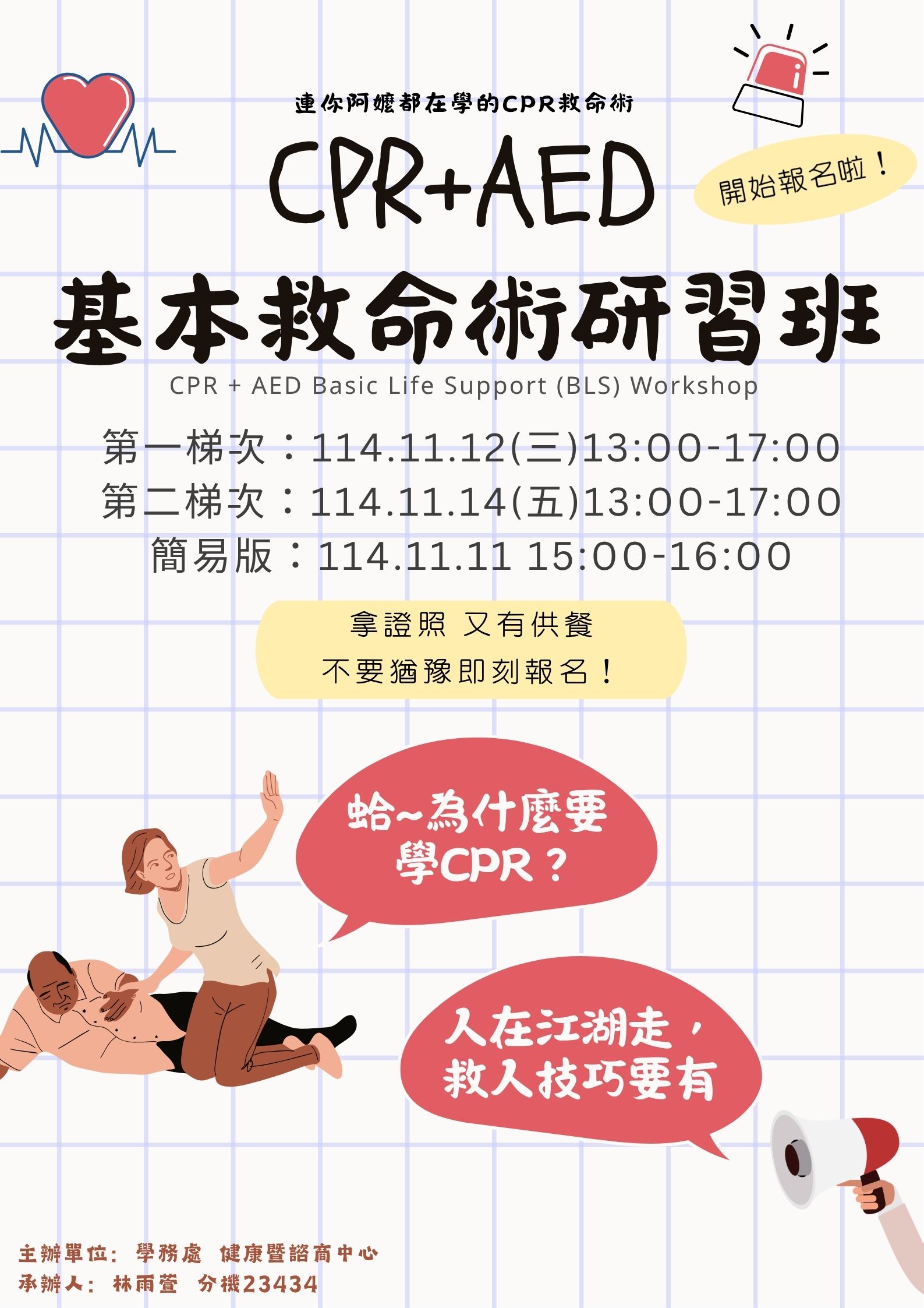 歡迎參加基本救命術研習證照班,讓你掌握基本急救知識與技能,提升應變能力。
