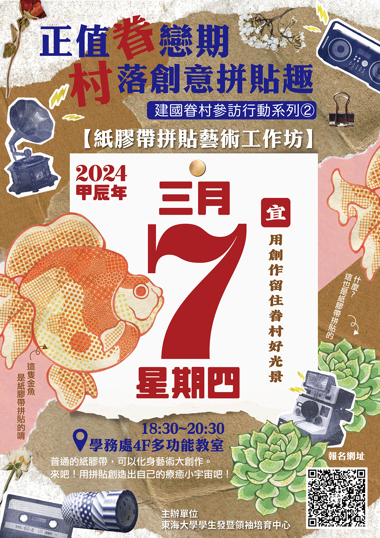| 【正值「眷」戀期「村」落創意拼貼趣-建國眷村參訪行動系列②】 加入Google行事曆 | 東海大學學務處4樓多功能教室 | 2024-03-07 ~ 2024-03-07 | 18:20 ~ 20:35 | 2 | 45 | 38 |