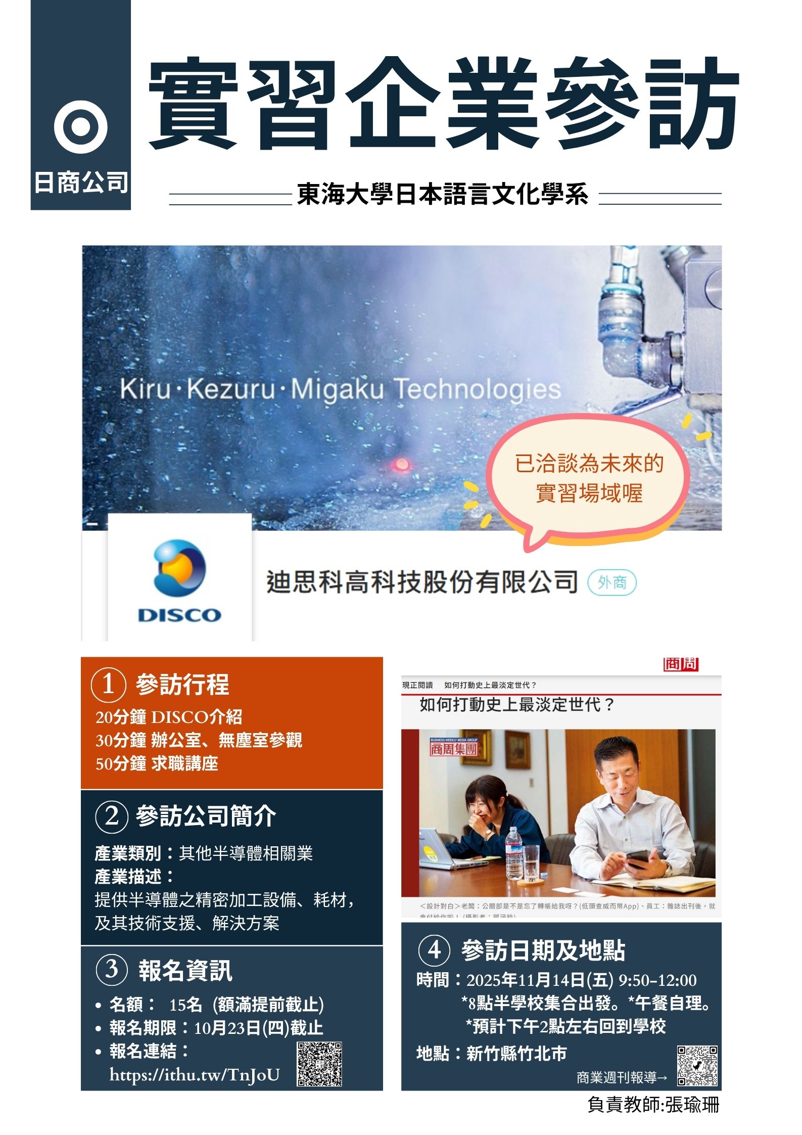 | 日文系114學年實習企業參訪活動 加入Google行事曆 | 新竹 | 2025-11-14 ~ 2025-11-14 | 08:00 ~ 18:00 | 5 | 15 | 13 |