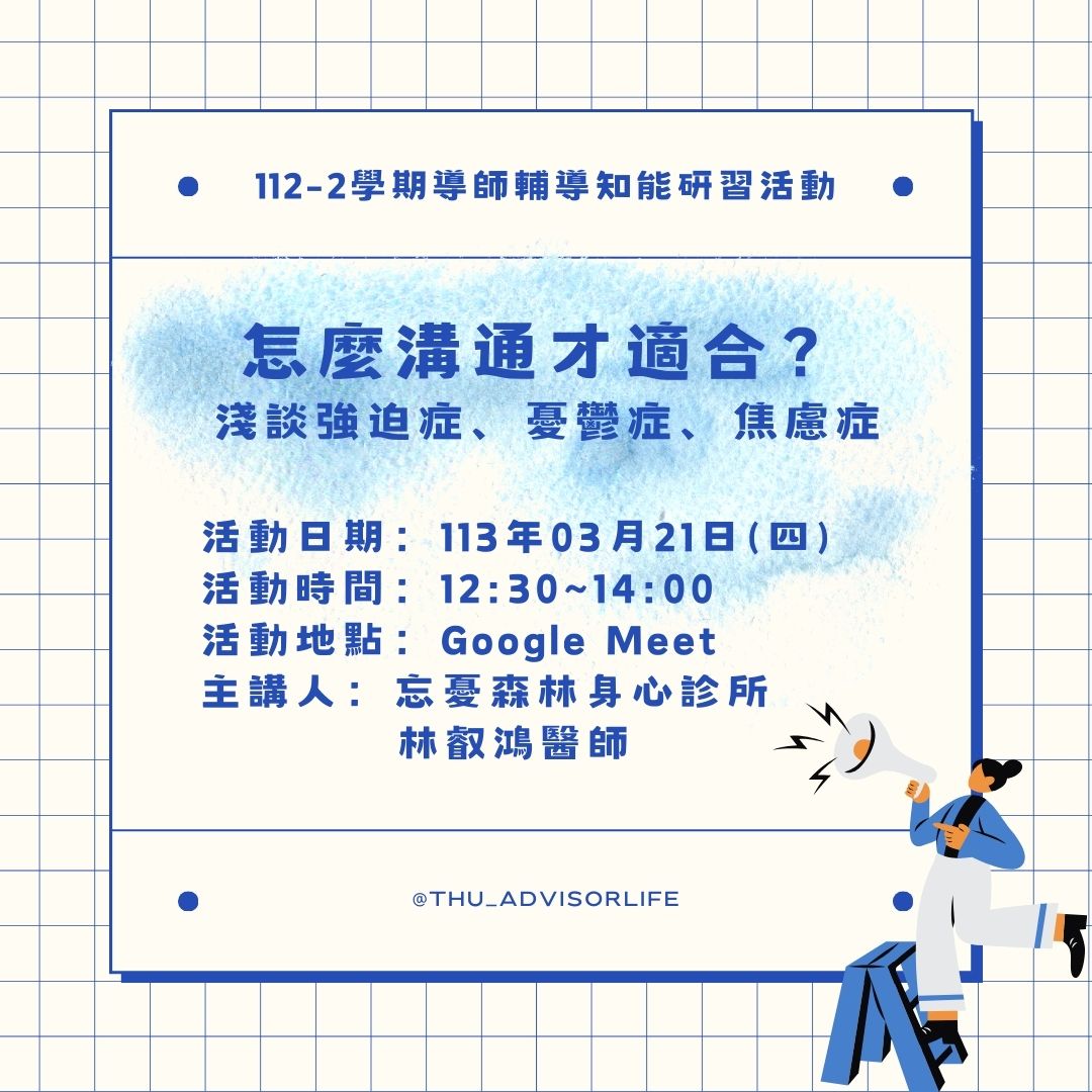 | 3/21怎麼溝通才適合?─淺談強迫症、憂鬱症、焦慮症 加入Google行事曆 | Google Meet (https://meet.google.com/zfx-caiv-yyv) | 2024-03-21 ~ 2024-03-21 | 12:30 ~ 14:00 | 2 | 不限 | 263 |