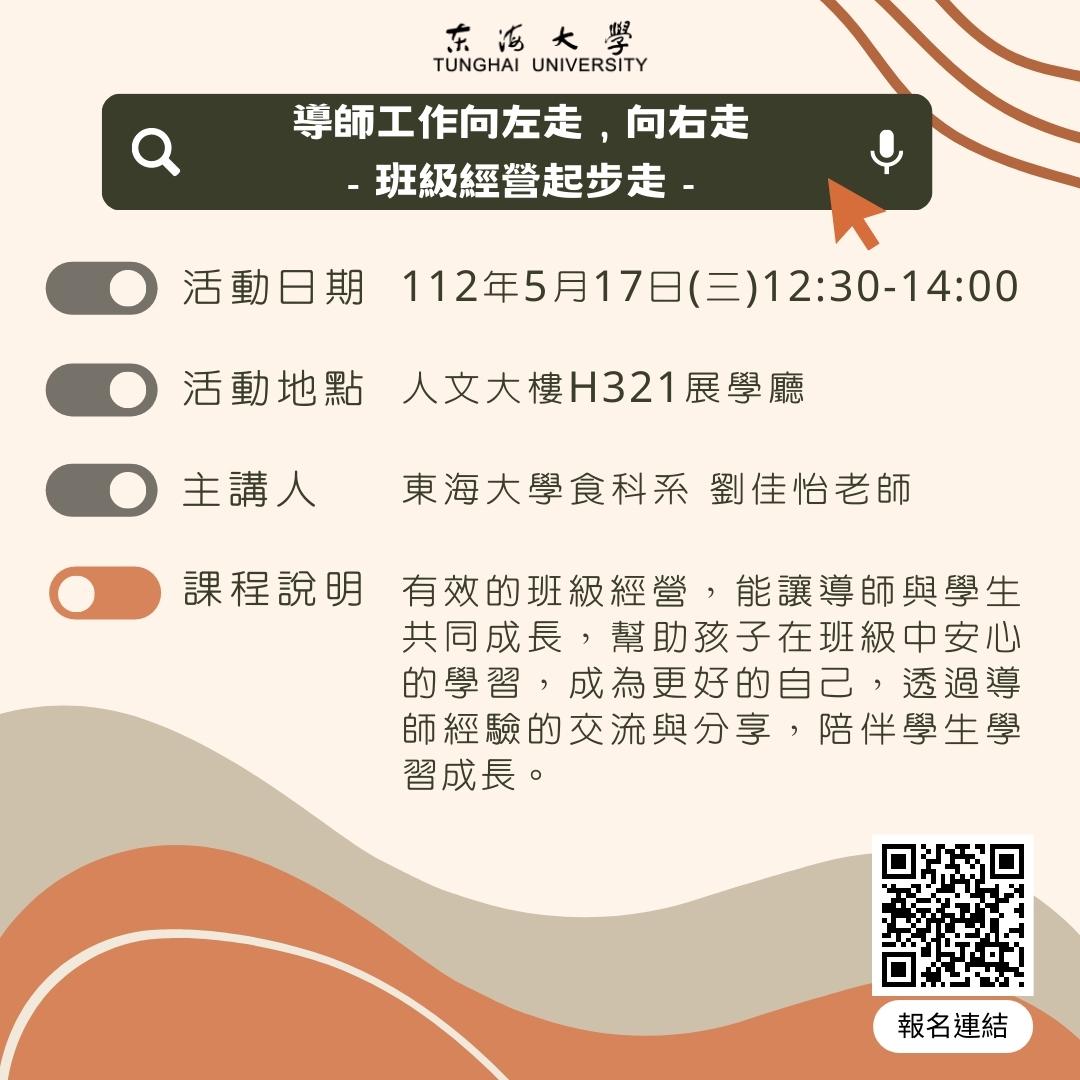| 5/17導師工作向左走,向右走-班級經營起步走 加入Google行事曆 | 人文大樓H321展學廳 | 2023-05-17 ~ 2023-05-17 | 12:30 ~ 14:00 | 2 | 42 | 51 |