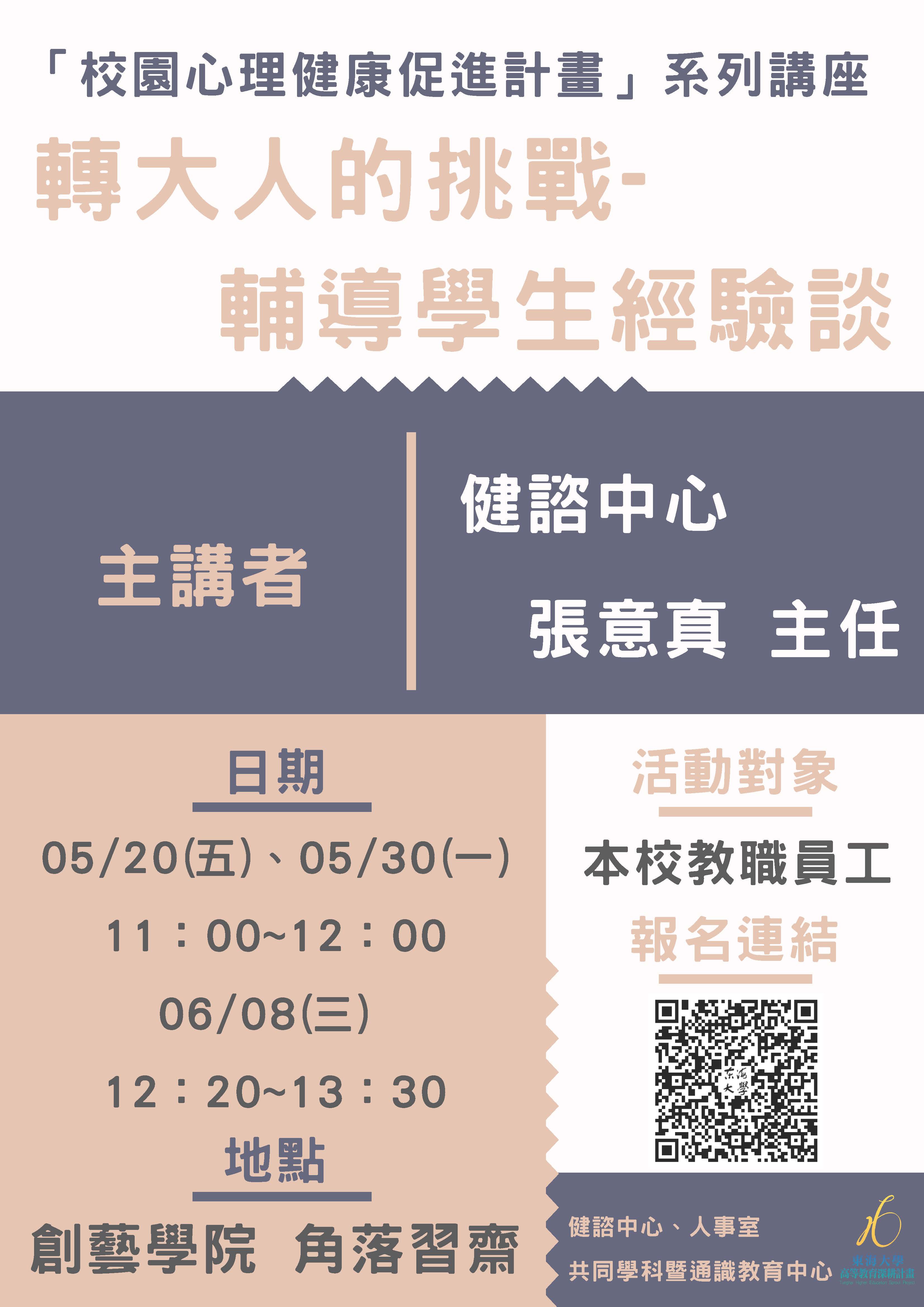 成長是一個不斷轉變的歷程,面對學生成長所出現的各種情況,尤其是釋放出有危險或特殊需求的時候,如何給予關心、陪伴,甚至是化解危機皆是需要我們持續學習與探討。邀請本校教職員一起參與、分享及討論,學習如何裝備自己、運用自己,成為陪伴學生轉大人之貴人。