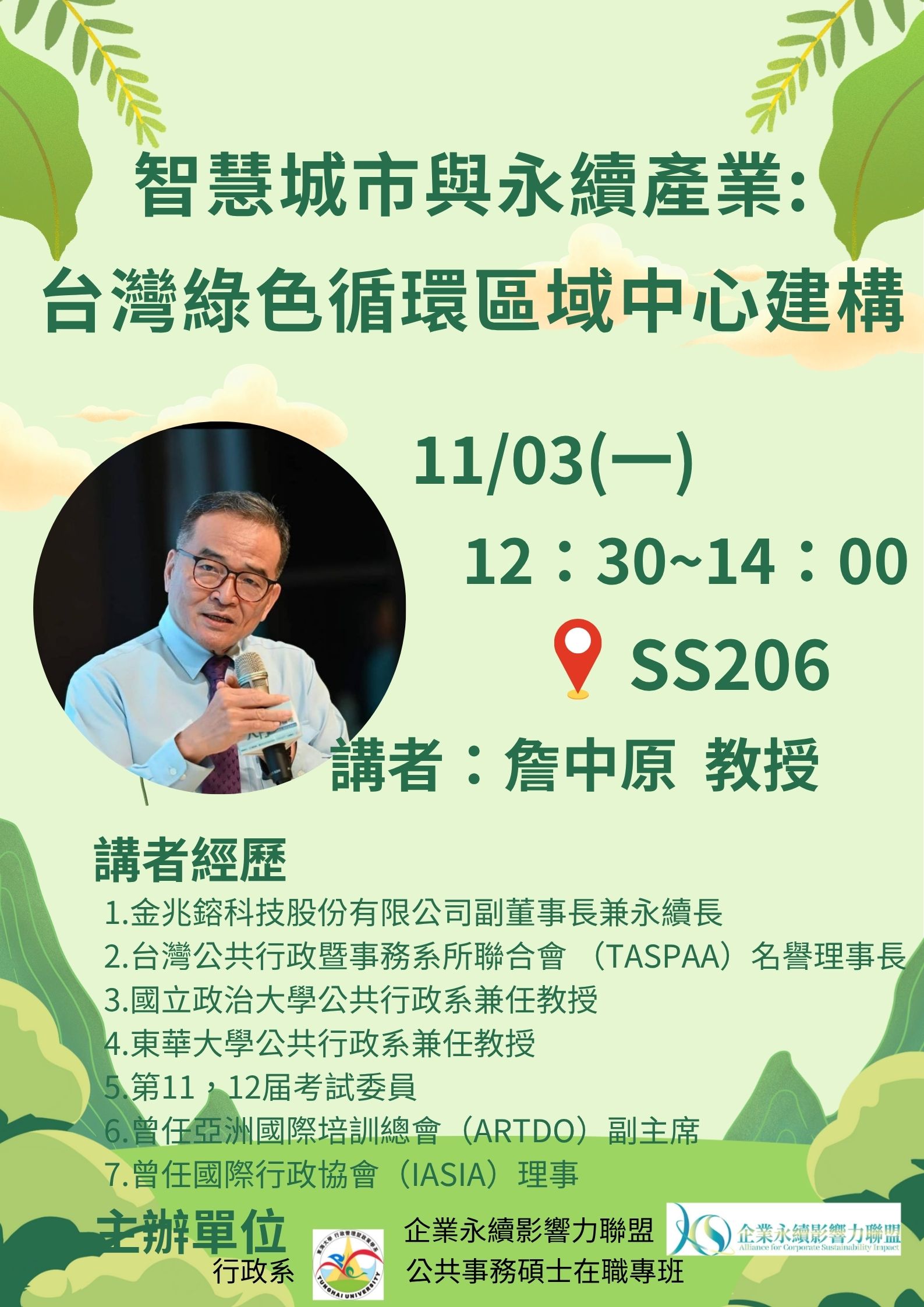 【行政講堂】11/3(一) 智慧城市與永續產業:台灣綠色循環區域中心建構,詹中原 (金兆鎔科技股份有限公司副董事長暨ESG永續長)【終身學習護照、勵學基金】