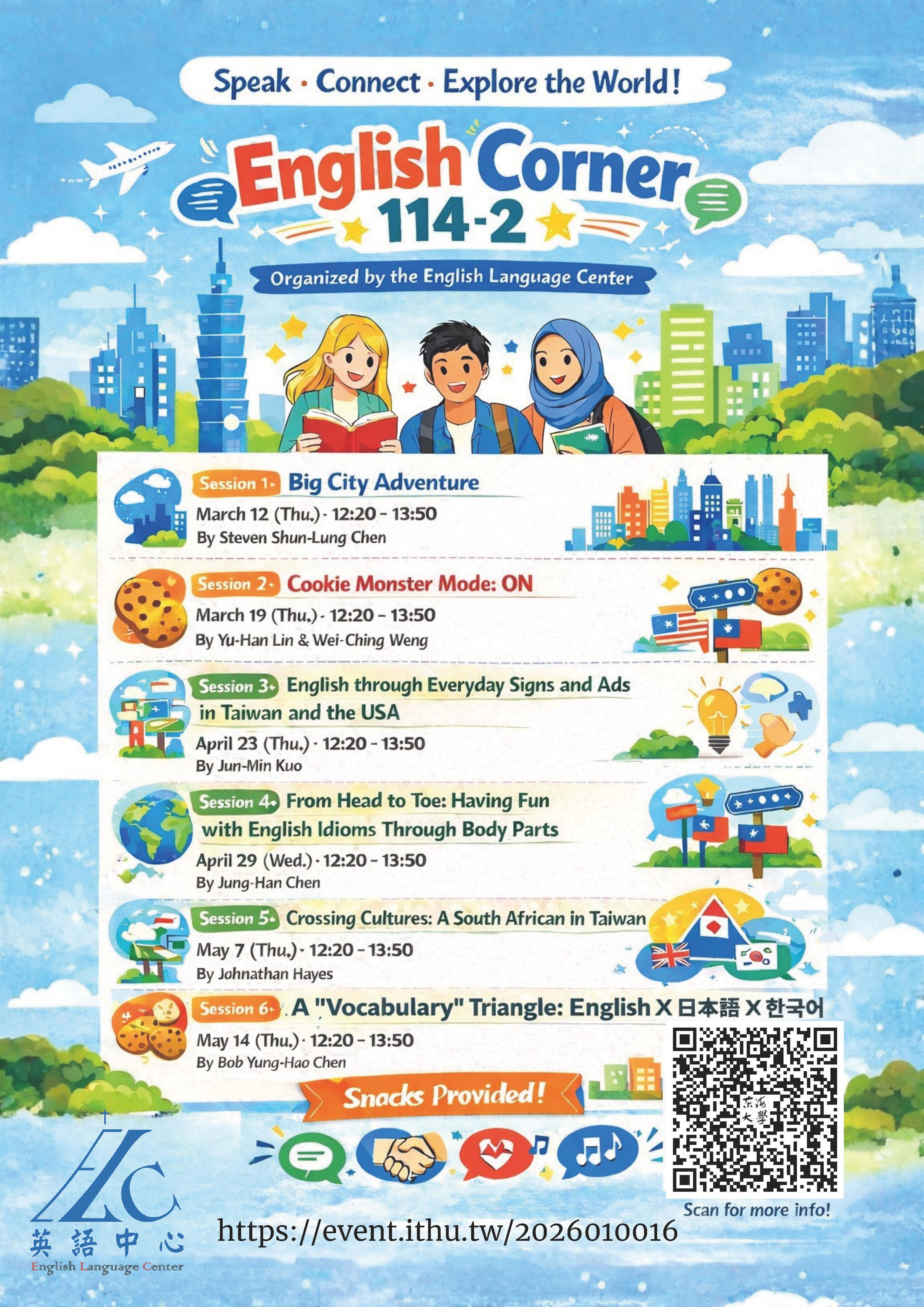 | Session 6: A "Vocabulary" Triangle: English X 日本語 X 한국어 (by Mr. Bob Yung-Hao Chen) 加入Google行事曆 | LAN105 | 2026-05-14 ~ 2026-05-14 | 12:20 ~ 13:50 | 1.5 | 30 | 30 |