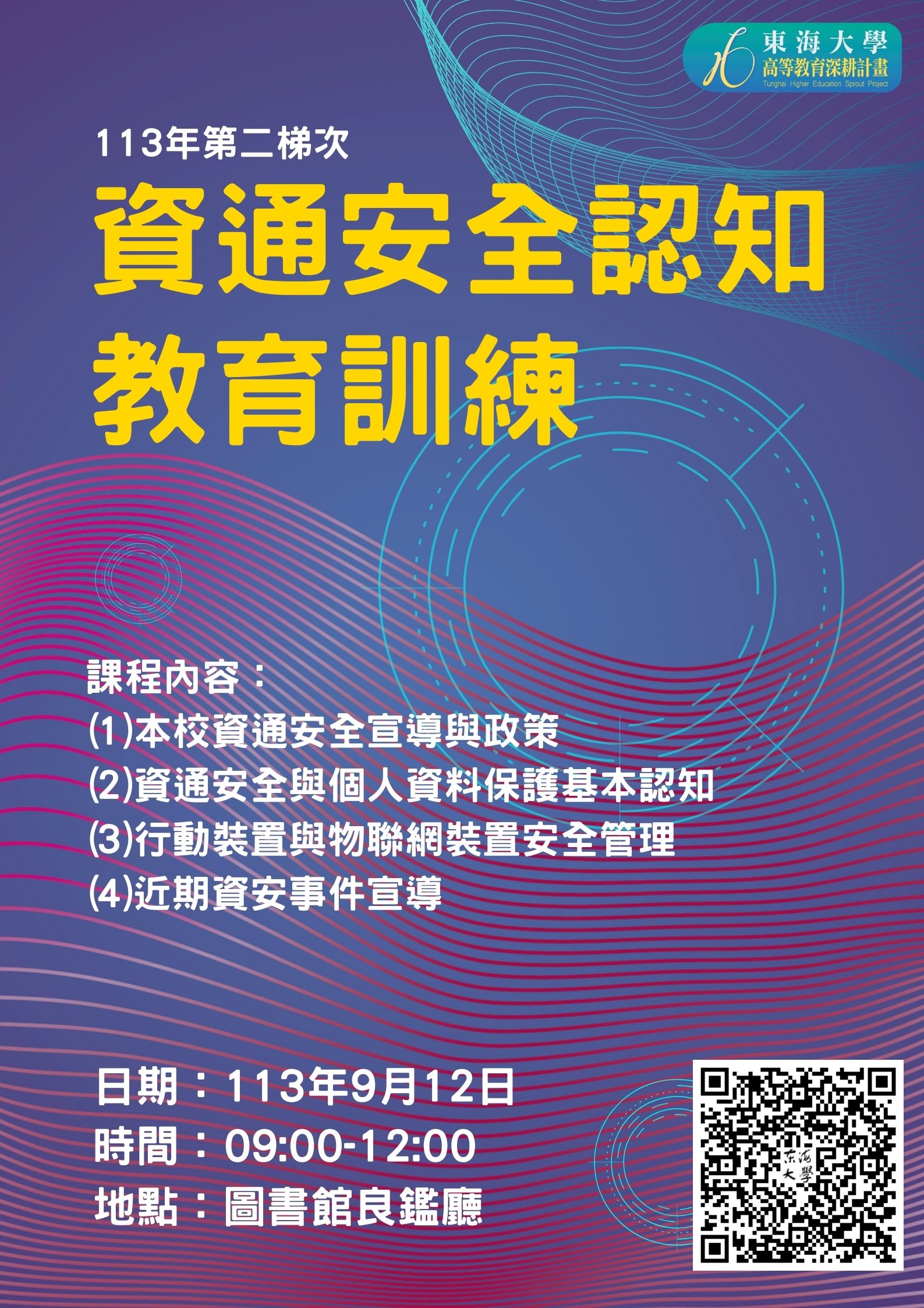 | 113年資通安全認知教育訓練(第二梯次) 加入Google行事曆 | 圖書館良鑑廳 | 2024-09-12 ~ 2024-09-12 | 09:00 ~ 12:00 | 3 | 90 | 101 |