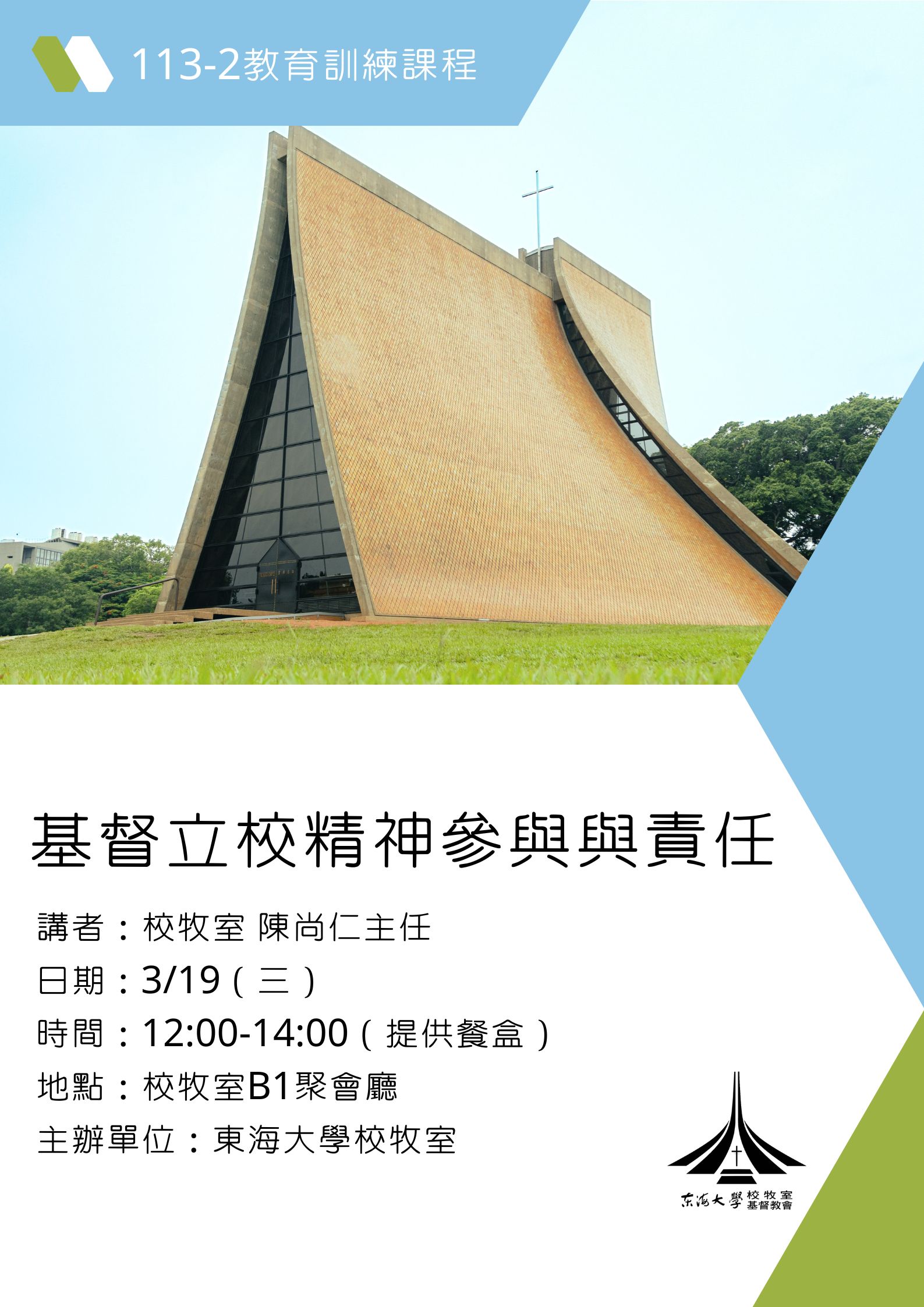 | 基督立校精神參與與責任 加入Google行事曆 | 校牧室B1聚會廳 | 2025-03-19 ~ 2025-03-19 | 12:00 ~ 14:00 | 2 | 50 | 24 |