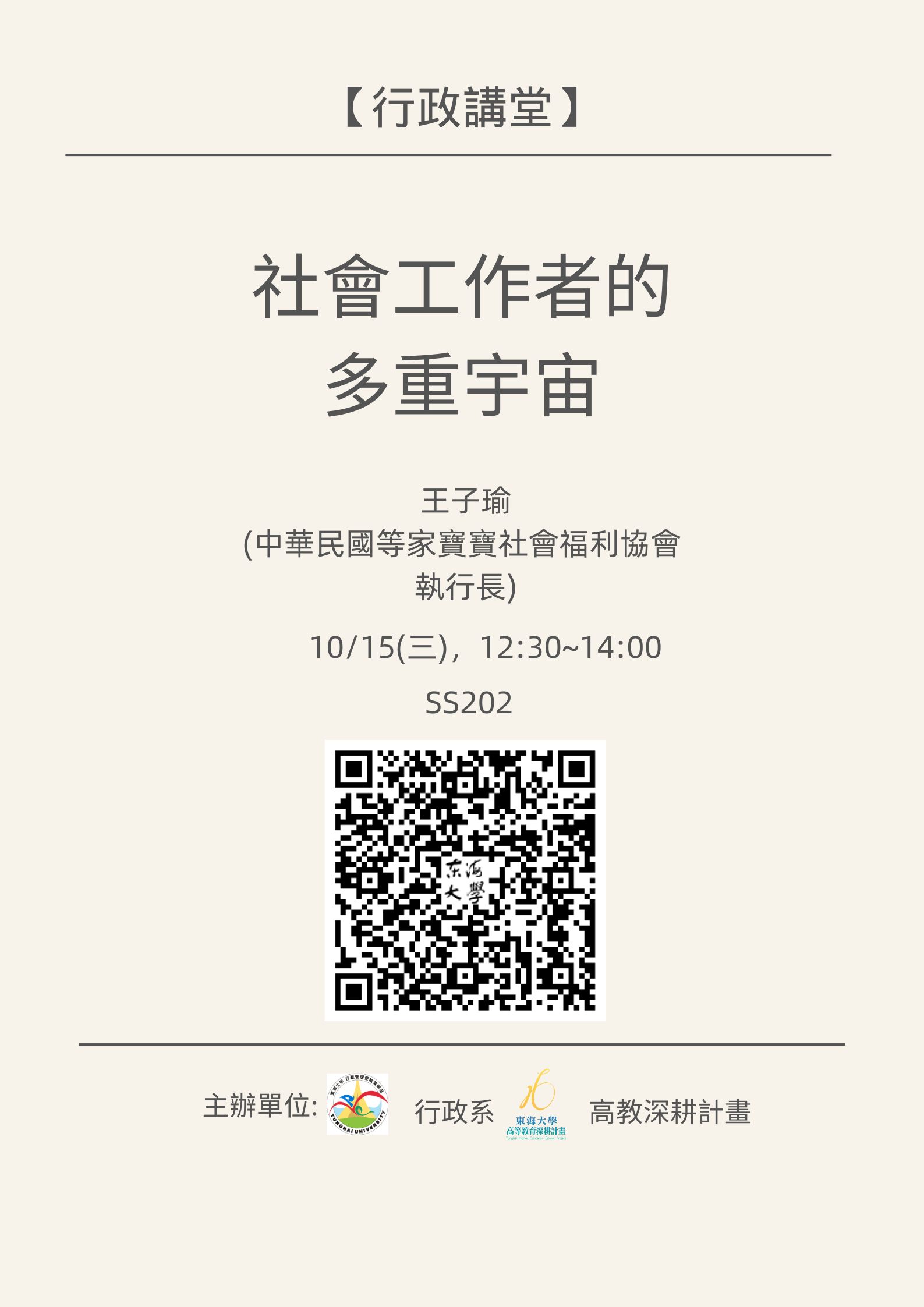 | 主辦單位:行政系、高教深耕計畫,10/15(三),12:30~14:00,SS202 加入Google行事曆 | SS202 | 2025-10-15 ~ 2025-10-15 | 12:30 ~ 14:00 | 1.5 | 125 | 63 |